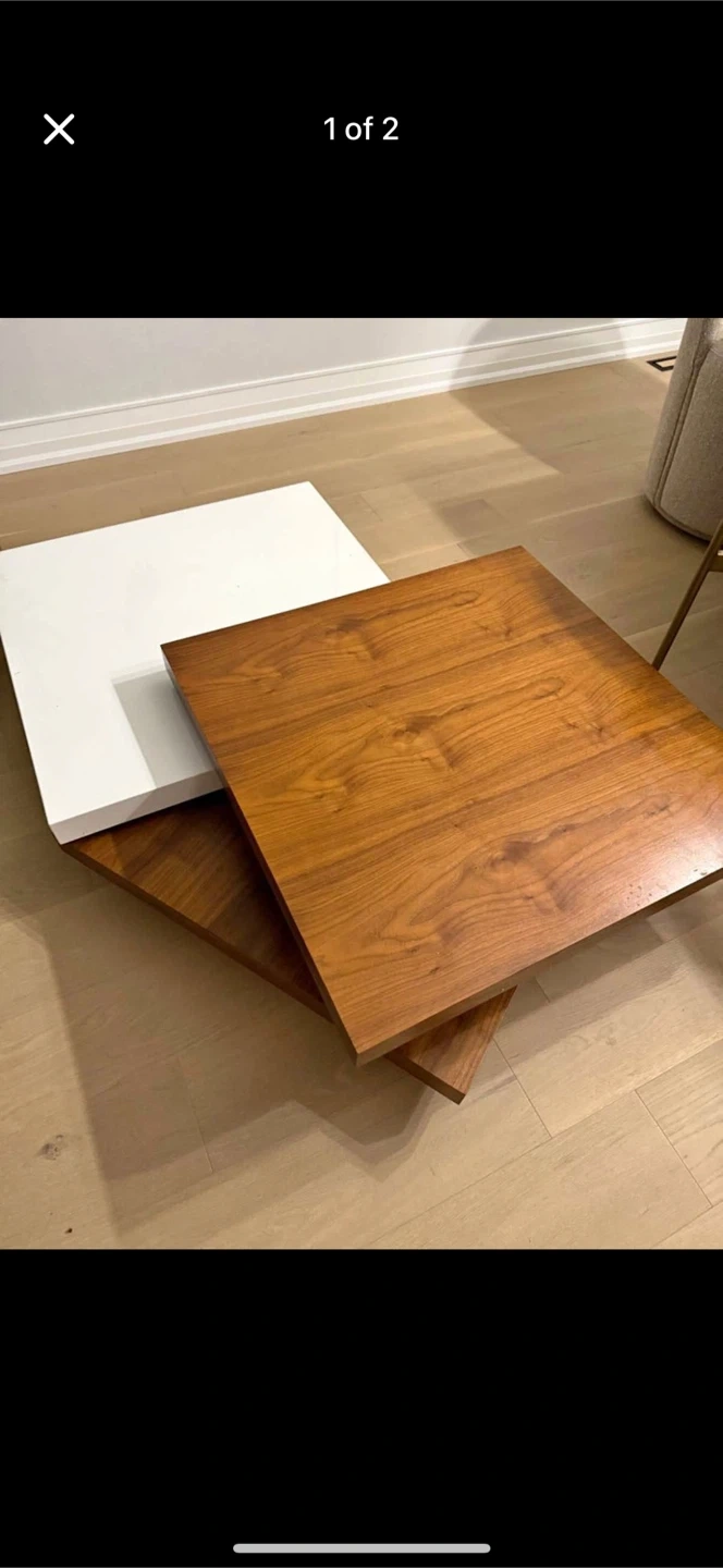 This is a Structube Picasso Swivel Coffee Table, also known as the Action Coffee Table by Beverly Hills Furniture, in a walnut and hi-gloss white finish.
