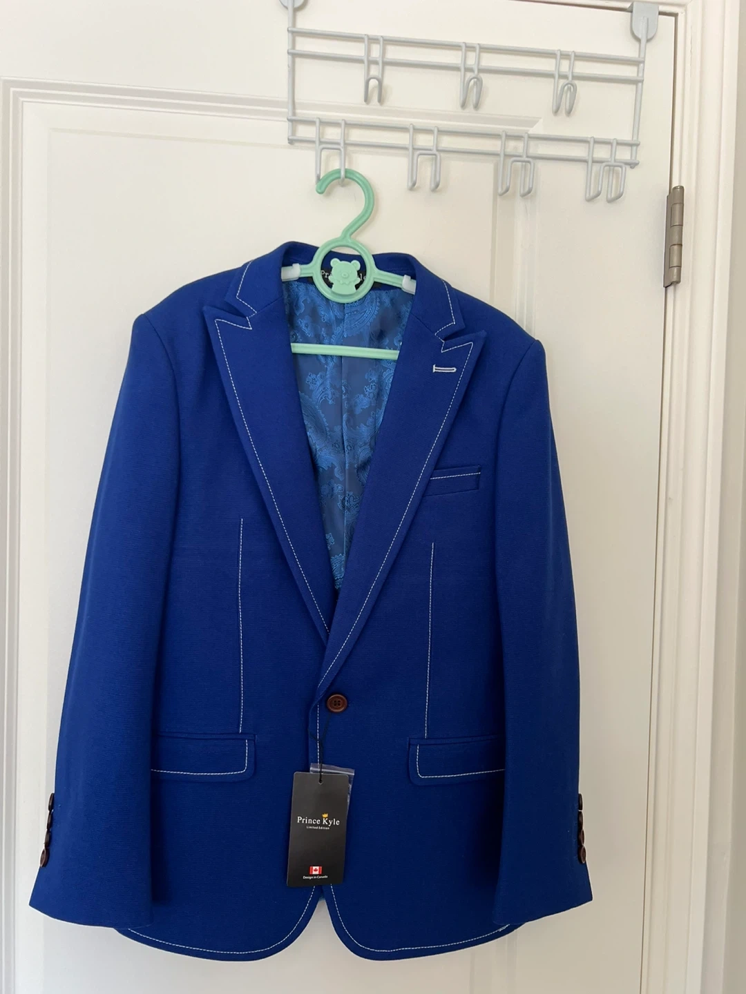 Selling a Prince Kyle suit in a vibrant blue! It includes the jacket, vest, shirt, bow tie, and pants. It's in excellent condition, new and ready for a special occasion