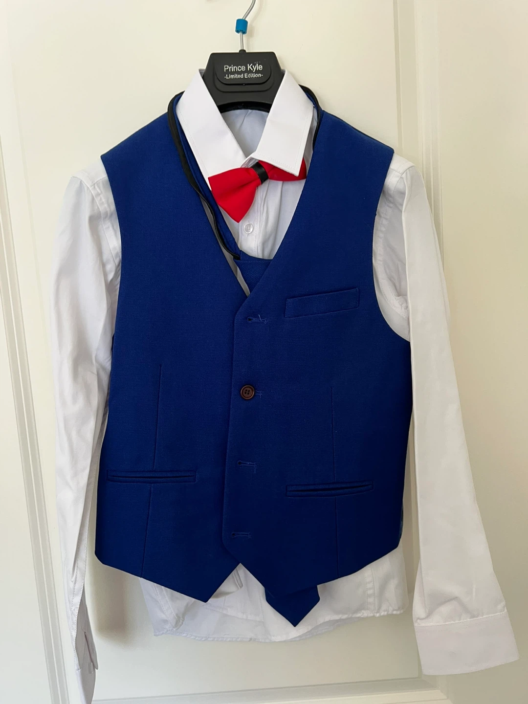 Selling a Prince Kyle suit in a vibrant blue! It includes the jacket, vest, shirt, bow tie, and pants. It's in excellent condition, new and ready for a special occasion