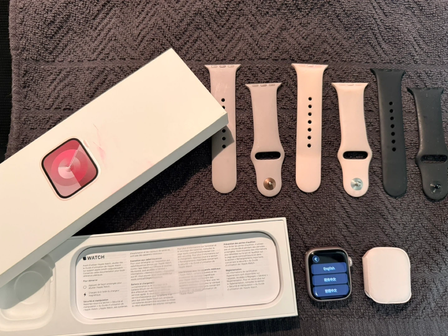 Selling an Apple Watch Series 9, 41mm in a lovely light pink colour! It's in excellent condition and comes with the original box, 3 strap choices (the pink is discoloured from wear). No charger.