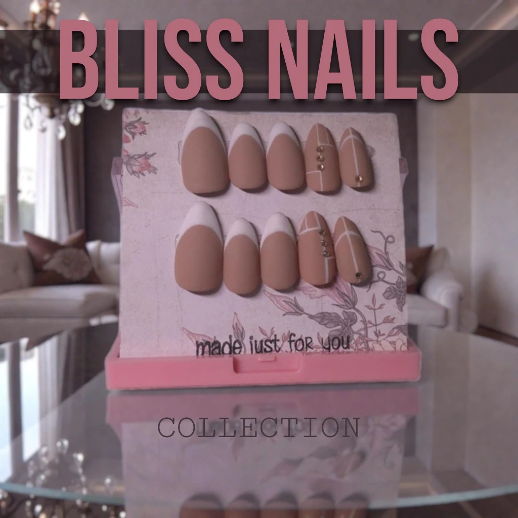 Matte nude and white ombré with crisp white line details and gold rhinestone accents. Minimalist chic meets subtle glam. Short almond shape, handcrafted perfection.