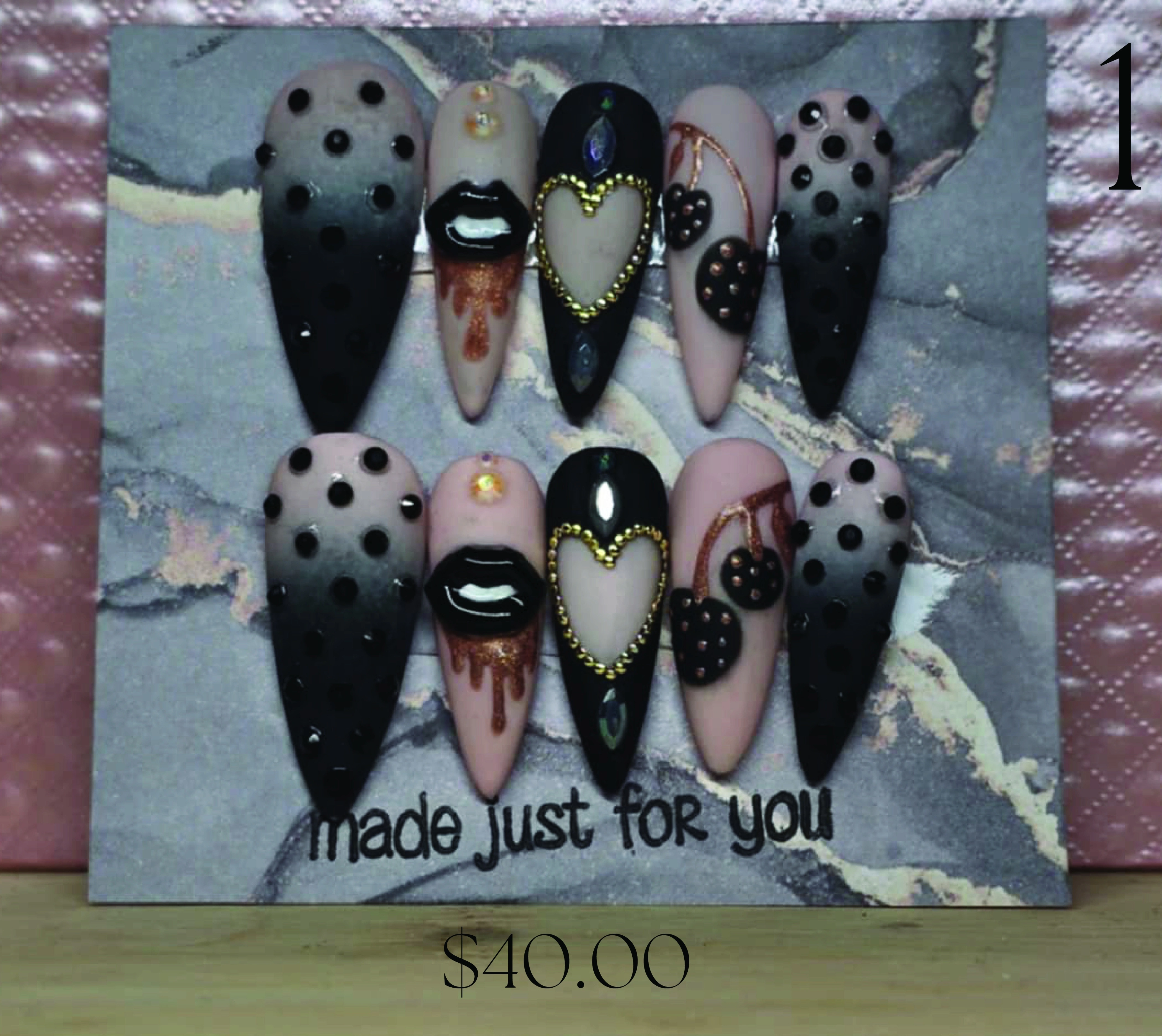 Dark, daring, and dripping in style. Black polish meets molten rose gold drips and beaded heart chains for the ultimate gothic-glam look. Stiletto length, handcrafted to perfection. Ready to wear. Made just for you. Large - 0-5-4-5-10 (0-4-3-4-7) Every set comes with a prep package including : ● Nail Glue ● Alcohol Wipe ● Wooden Stick ● Nail Adhesive Tab ● Nail File ● Instruction Card DM me if you want a custom set or have questions!