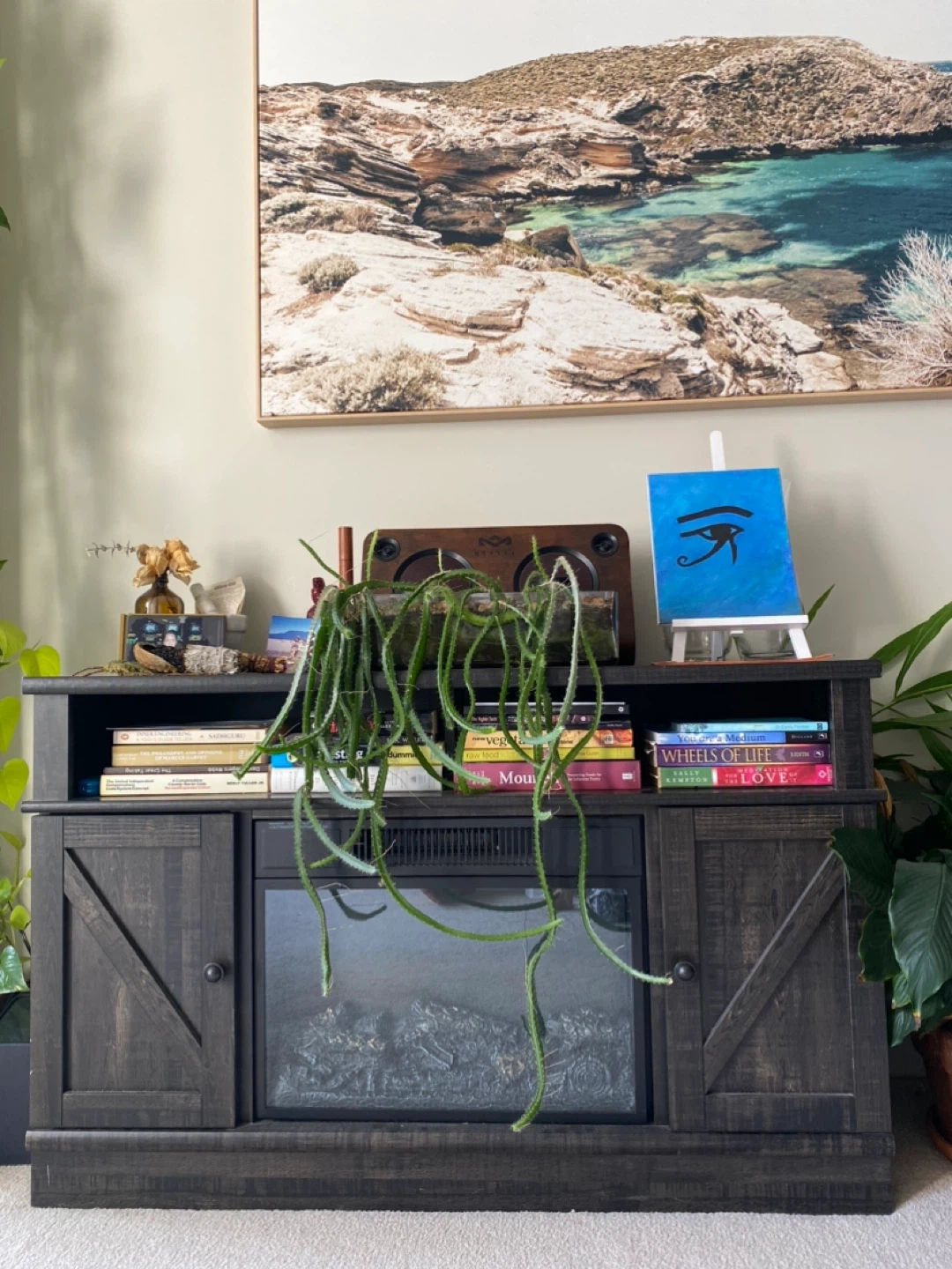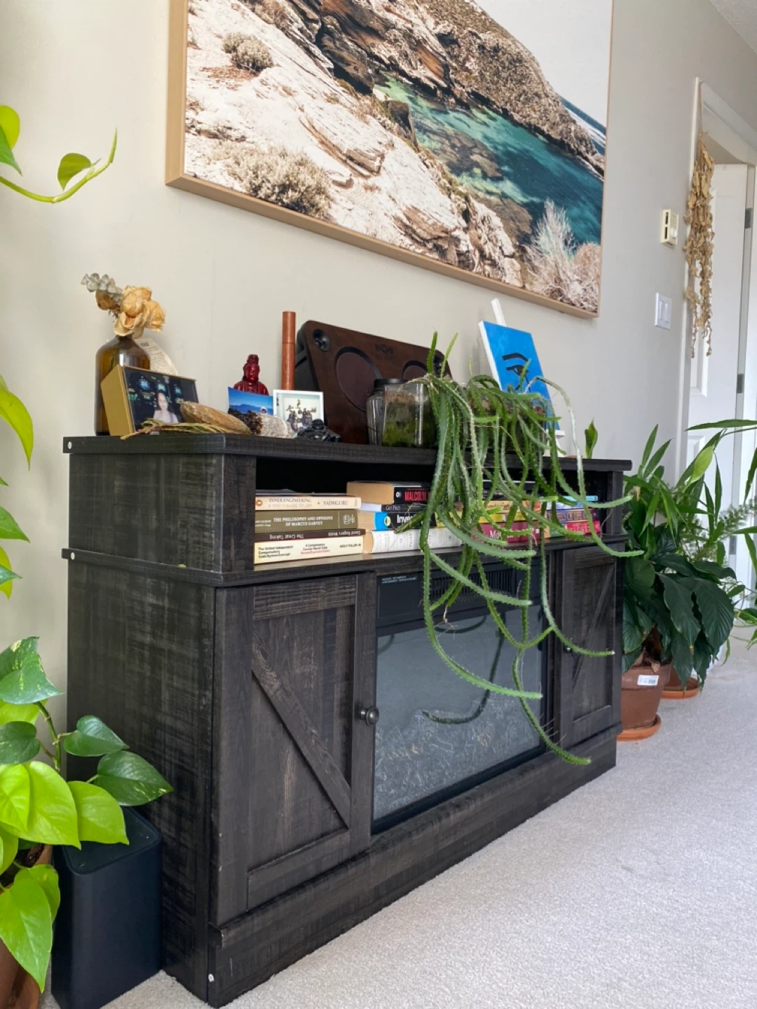 Fireplace and heater works great! Great storage for books and games. Has 3 storage areas. Good condition with some minor wear and tear.