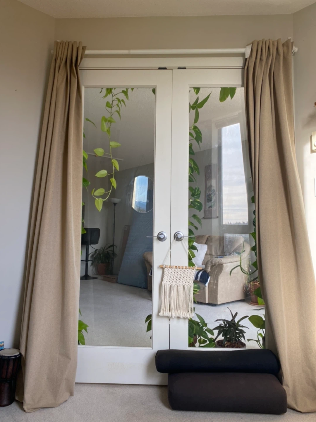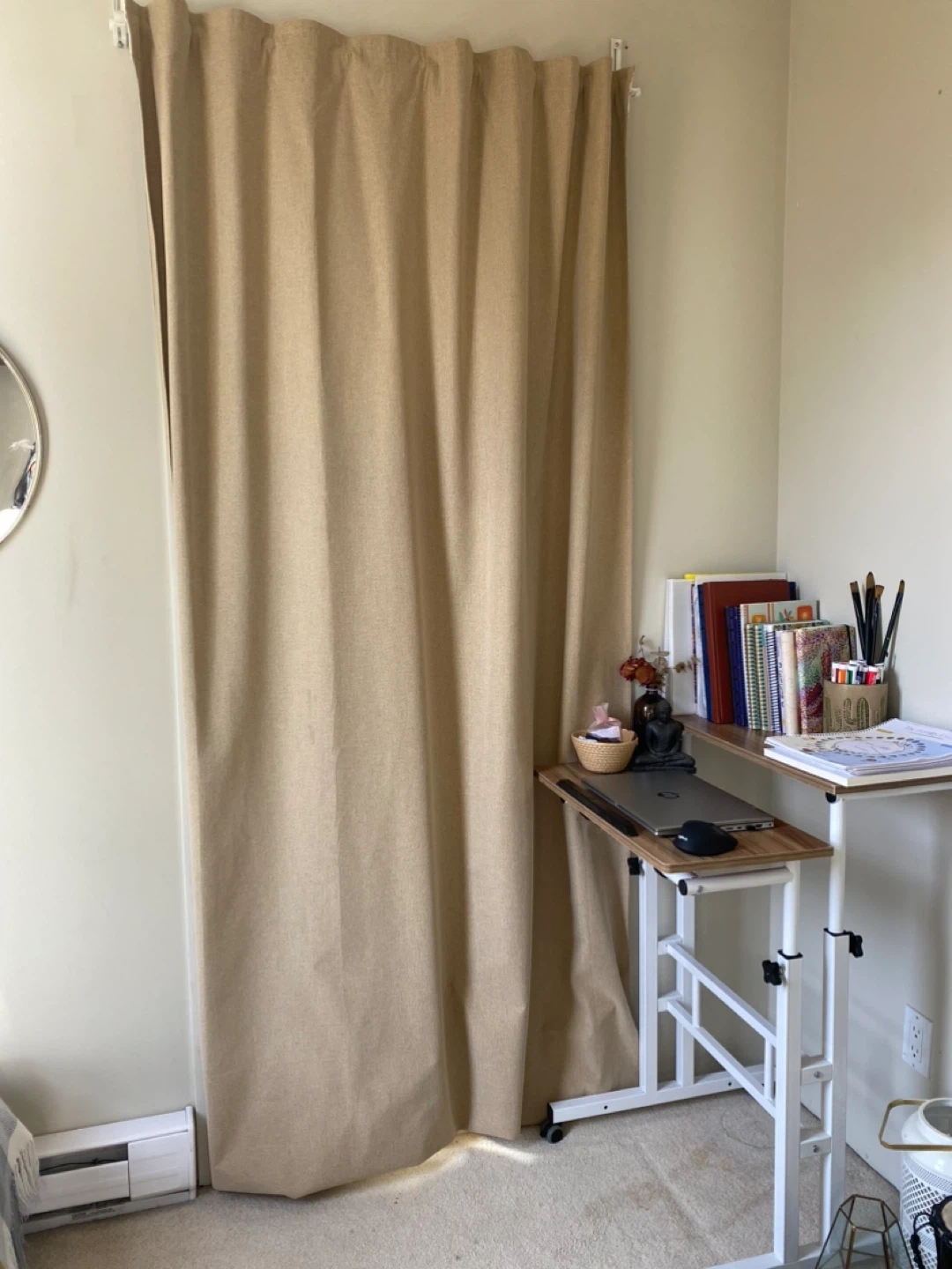 Beige curtains for sale! Great for adding a touch of warmth and privacy to any room. They're in great condition and ready for a new home. Throwing in the rods and brackets for free