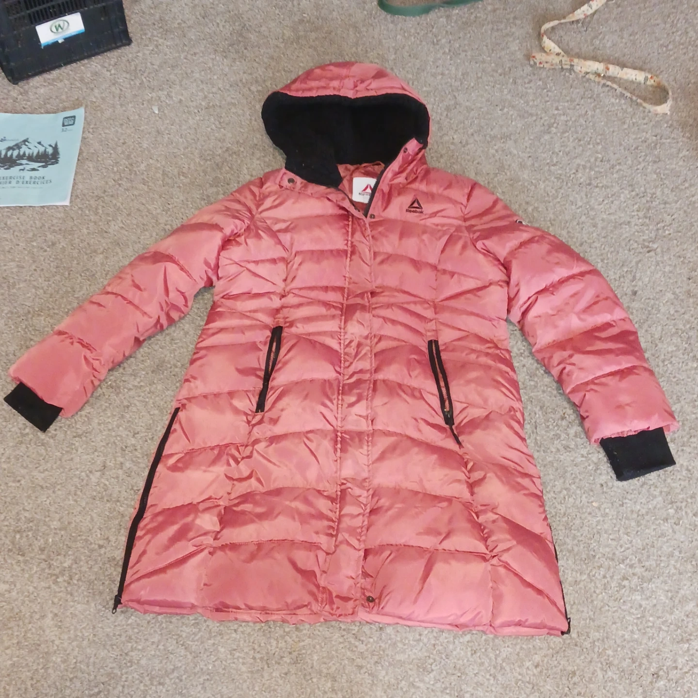 Cozy Reebok puffer jacket in size large. It's a lovely coral colour with a black fleece-lined hood. Perfect for staying warm this winter!