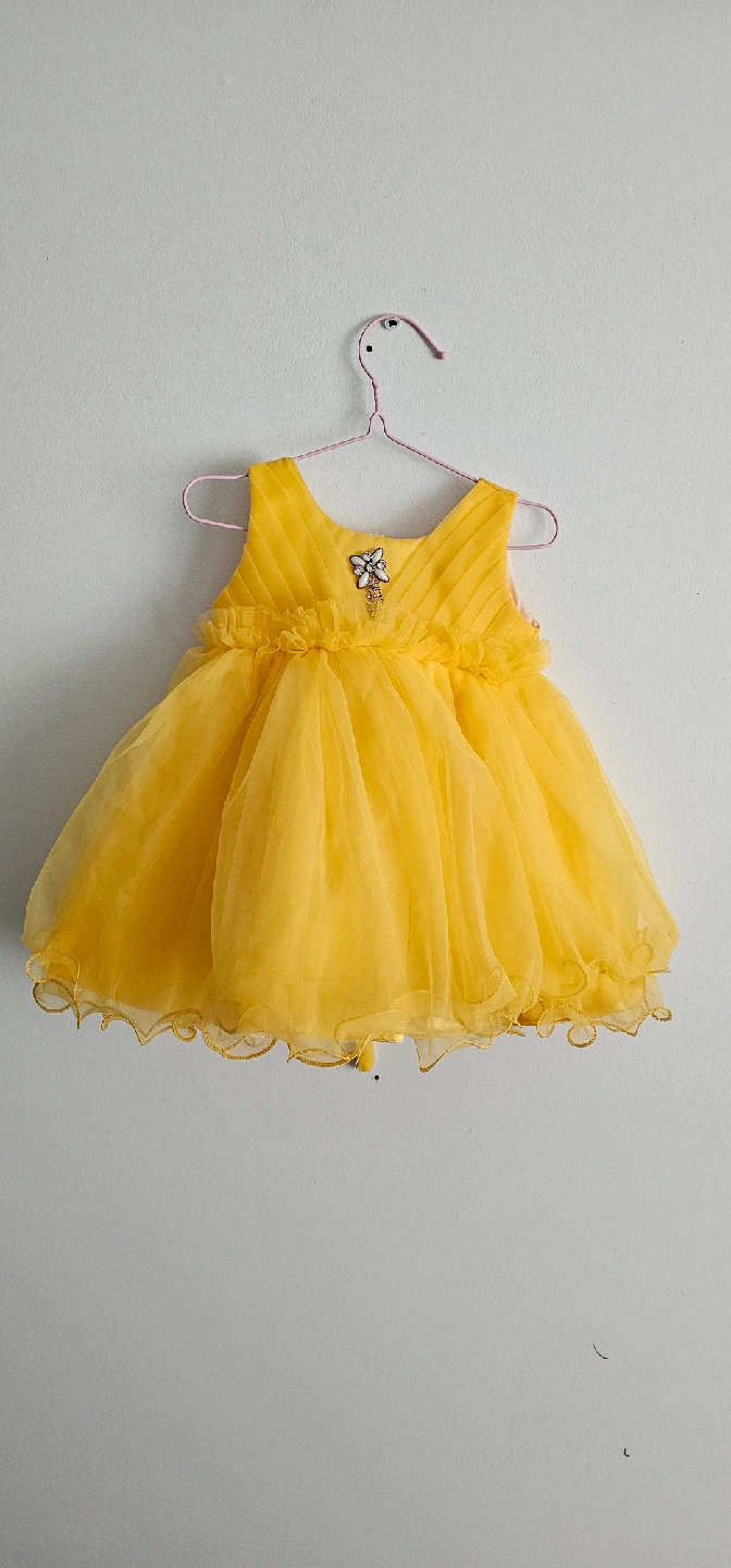 A cute yellow baby dress with a ruffled skirt and a decorative flower on the bodice. It's in great condition and perfect for a special occasion!