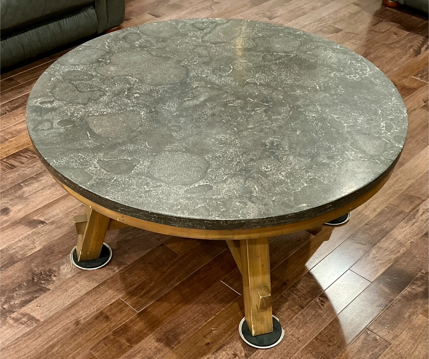 Selling a unique round coffee table featuring a beautiful heavy stone top and sturdy wooden legs. This table would be a great addition to any living room or sitting area! It has a stylish and modern look that will complement a variety of decor styles