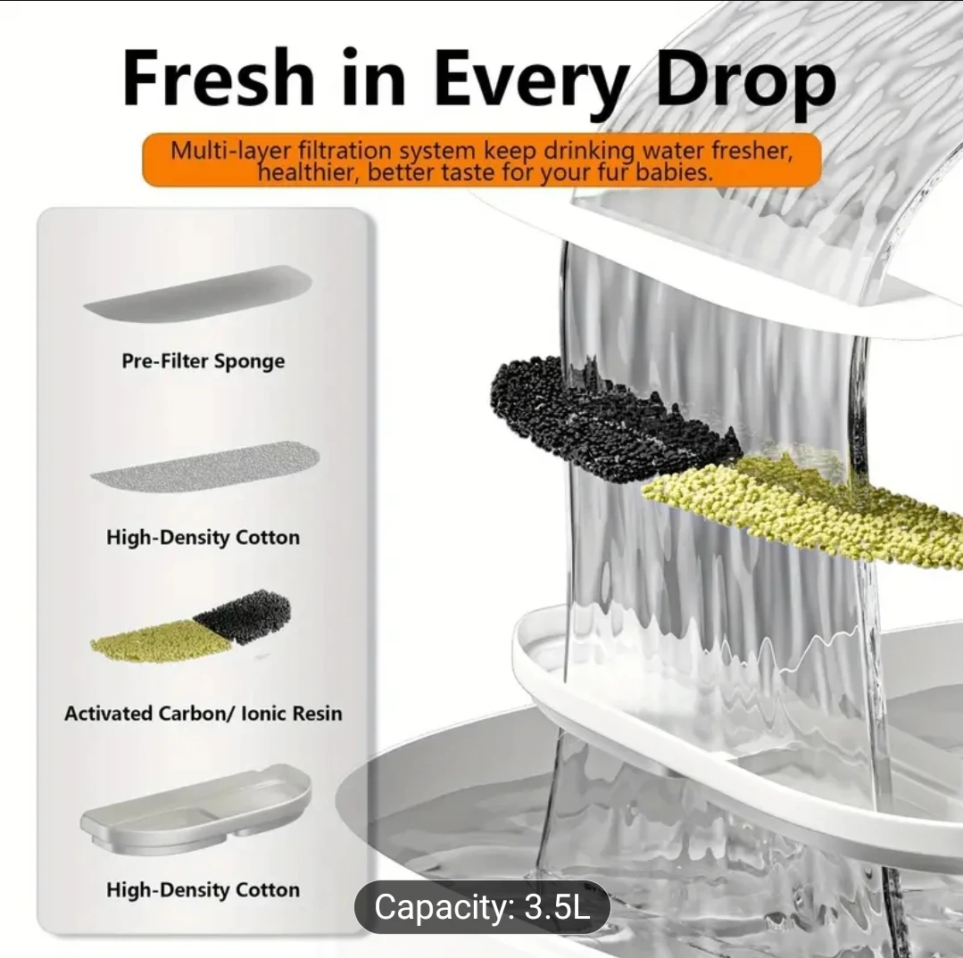 【Pro-Grade Filtration & Whisper-Quiet Operation (<30dB)】Our advanced 3-stage filtration system is designed for premium water quality: ① Dual-layer cotton for hair/particle removal. ② Activated carbon + resin for odor elimination. ③ Food-grade cotton for debris filtration. The ultra-silent pump operates quieter than a whisper (<30dB), ensuring peaceful hydration without disturbance. For lasting performance, we recommend regular cleaning to maintain peak filtration efficiency and pump longevity.