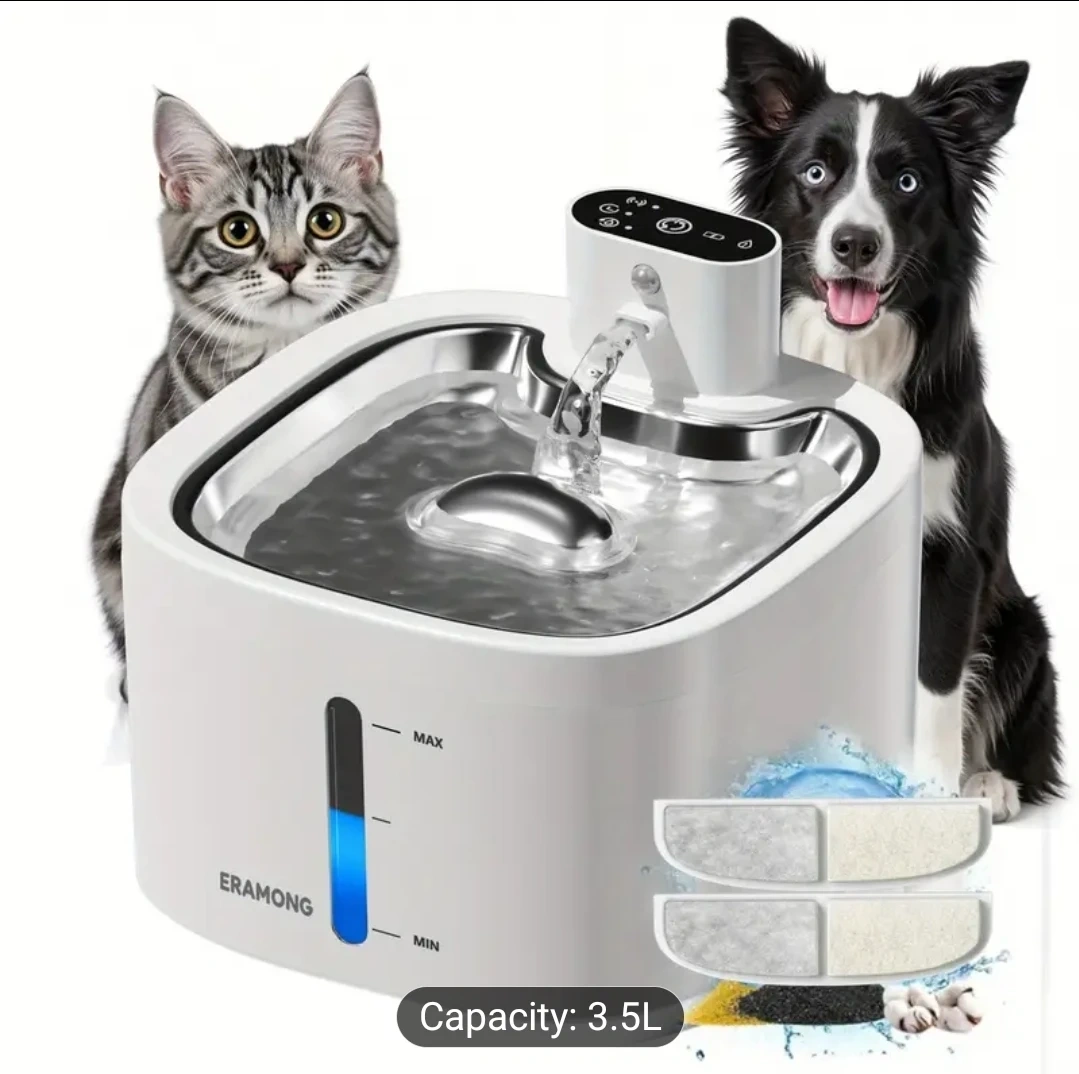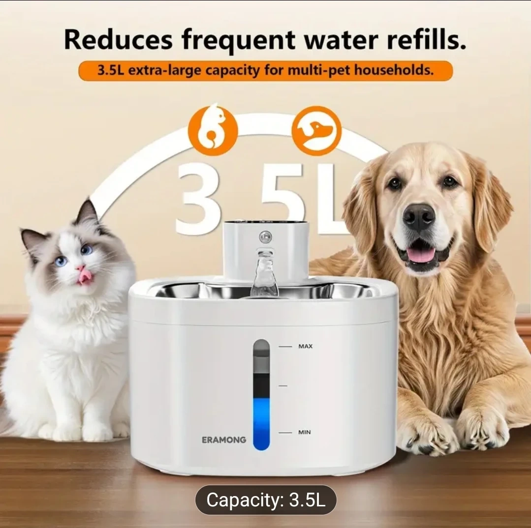"【3.5L Mega Capacity & 45-Day True Cordless (4000mAh)】This cordless cat water fountain delivers freedom: 3.5L large capacity provides *10-day hydration per fill* (refill only 3x/month for 1 cat), powered by a 4000mAh battery giving 45 days filtered water. Zero power cords allow placement anywhere without outlets. Ideal for travel, apartments, or multi-cat households.