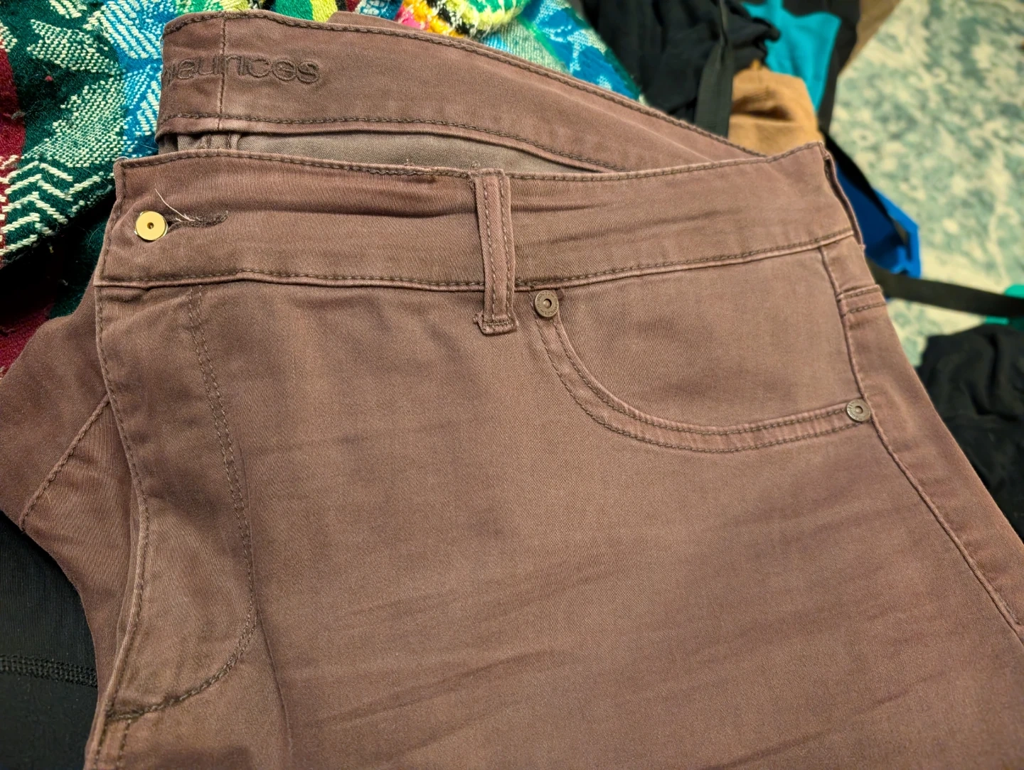 rehoming a pair of red/ brown pants from maurices. the button cover has come off and should be replaced but they otherwise are in good shape. cat friendly, smoke free home