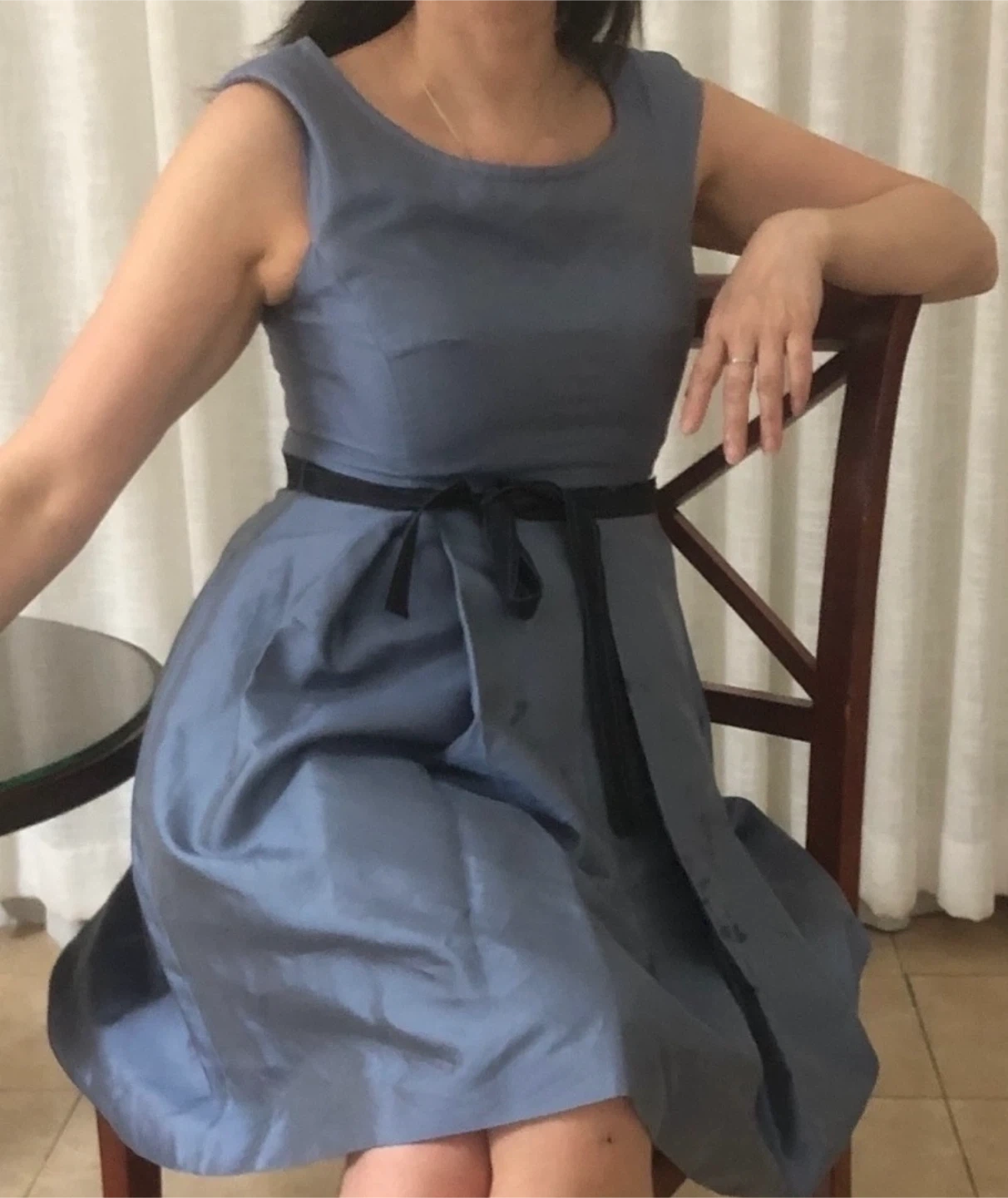A lovely blue dress with a black belt. It's in great condition and perfect for a special occasion or a night out. The dress has a classic and flattering silhouette. It would look great with heels or flats!