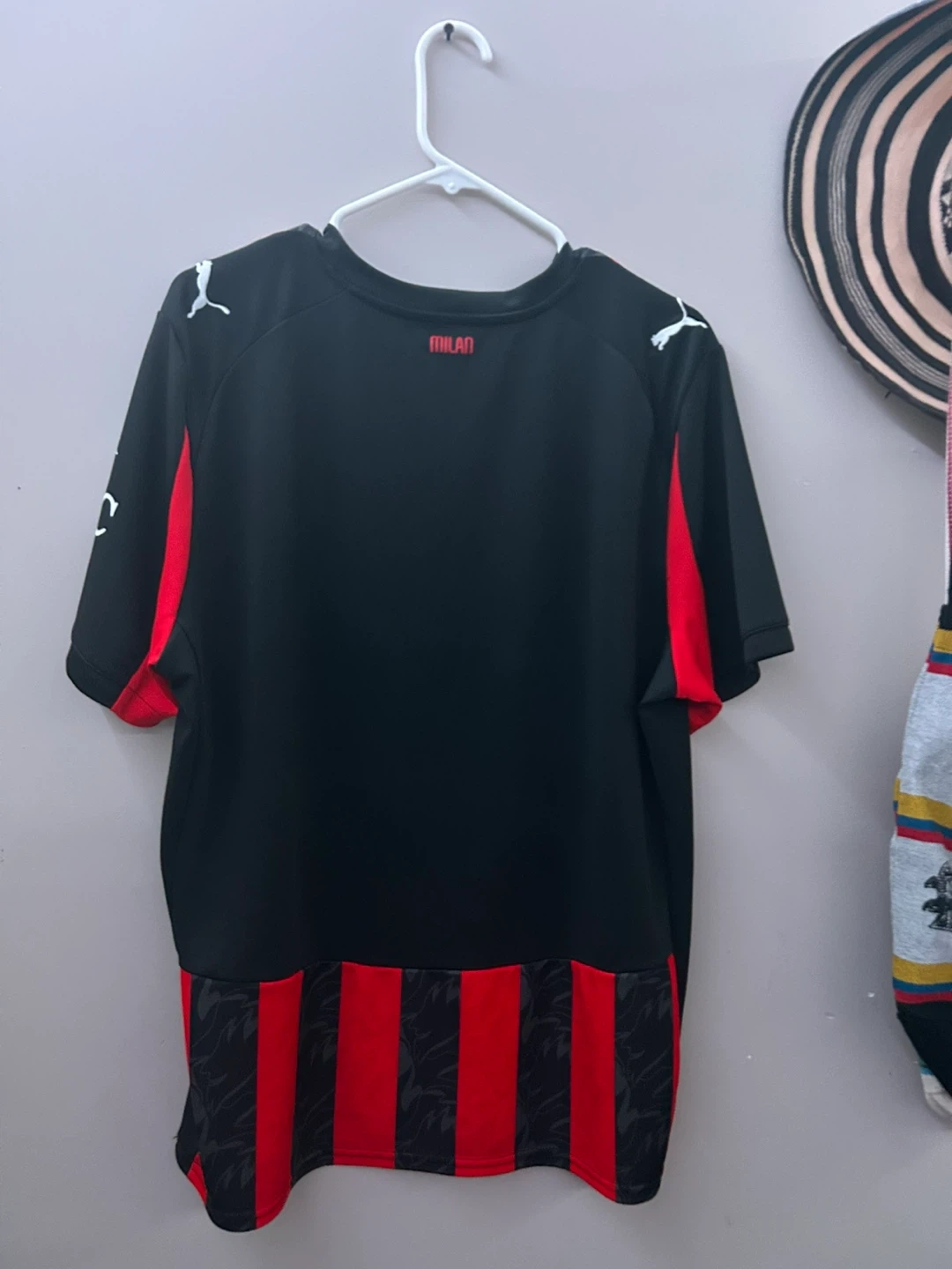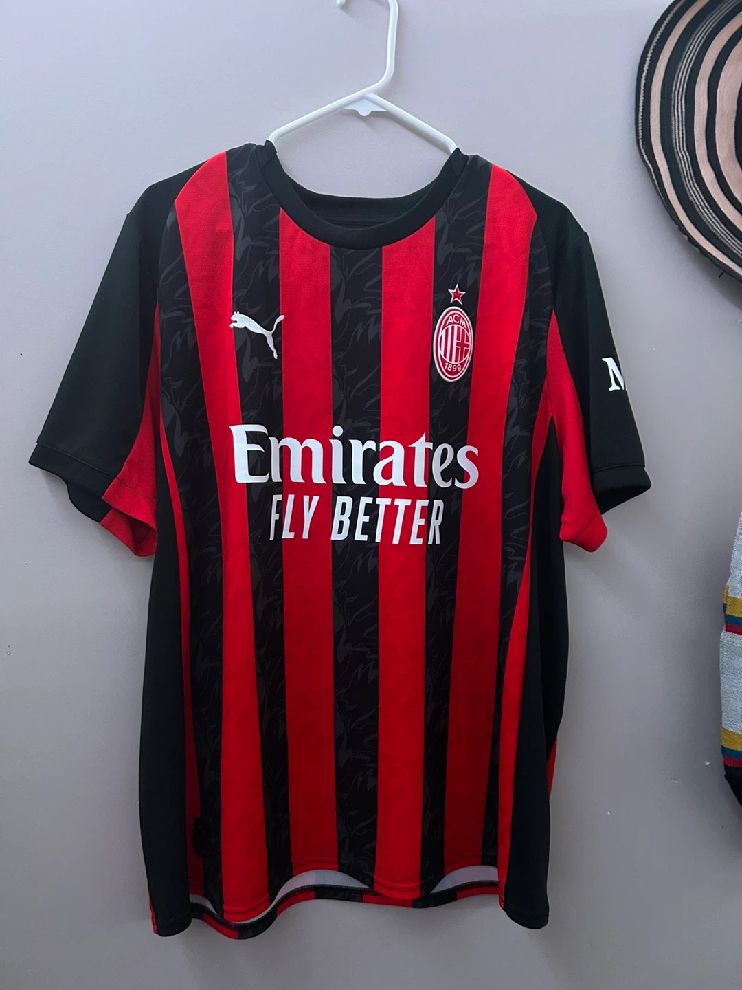 Selling an AC Milan soccer jersey by Puma. It features the Emirates Fly Better logo and the MSC logo on the sleeve. Great for any soccer fan!