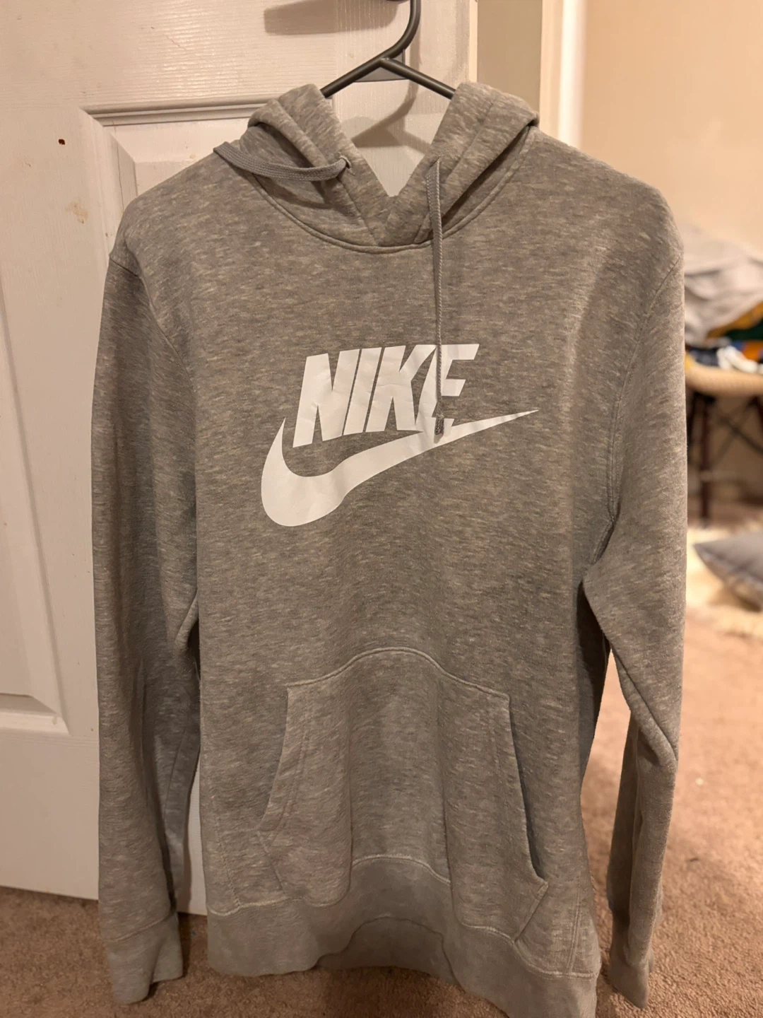 Selling a grey Nike hoodie! It's in great shape and ready for a new home. The classic Nike logo is prominently displayed on the front. Perfect for staying cozy and stylish.