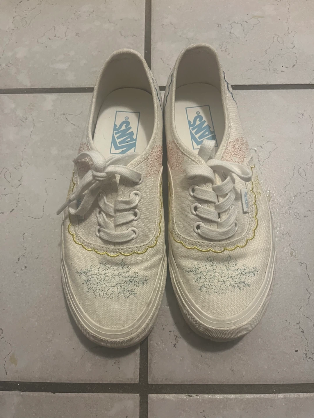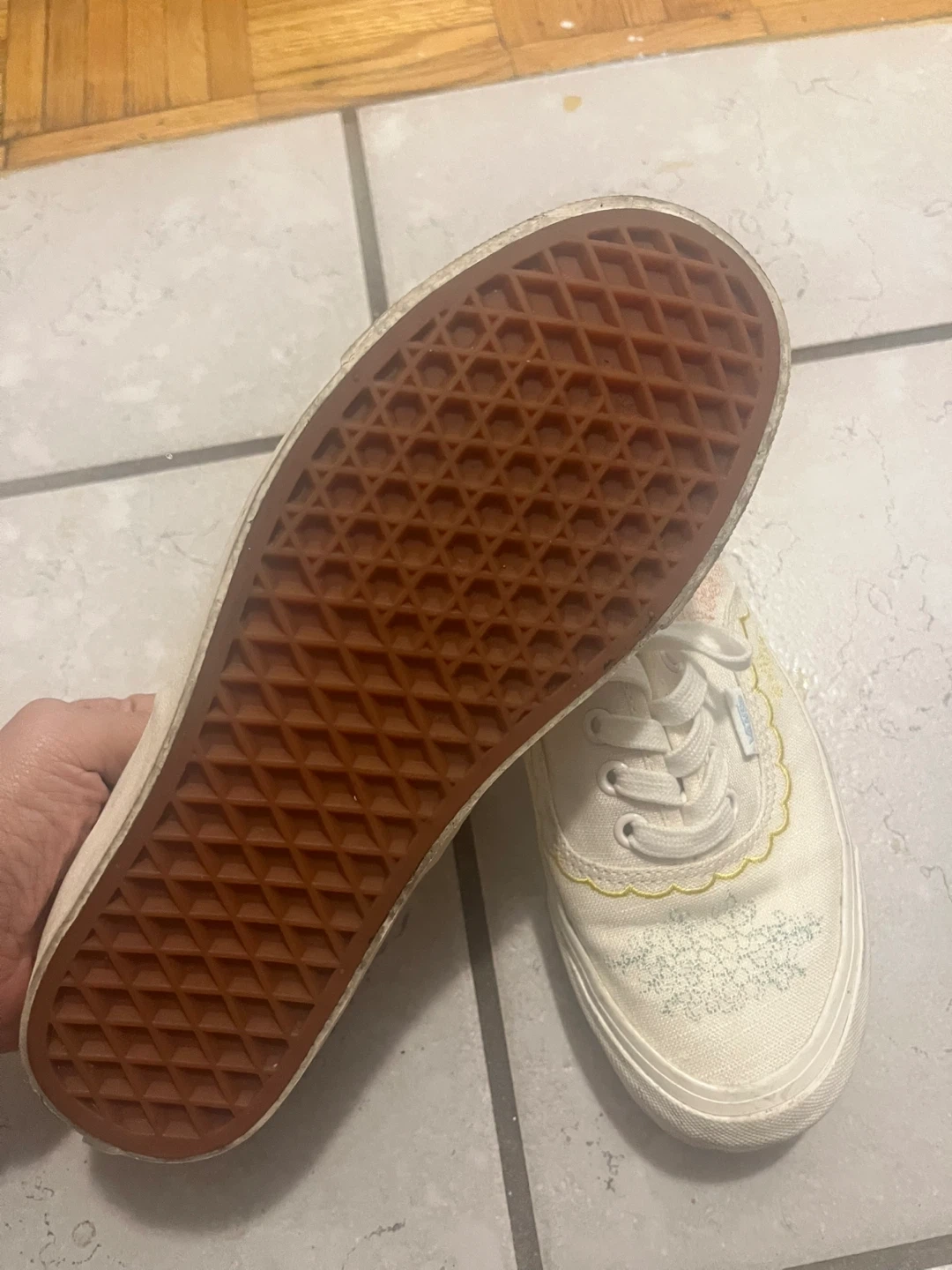 These super cute Vans Authentic Lo Pro sneakers are in great shape! They're a women's size 7.5 and feature a lovely floral design on a white-coloured canvas. Perfect for adding a touch of spring to your step! Onlu use once