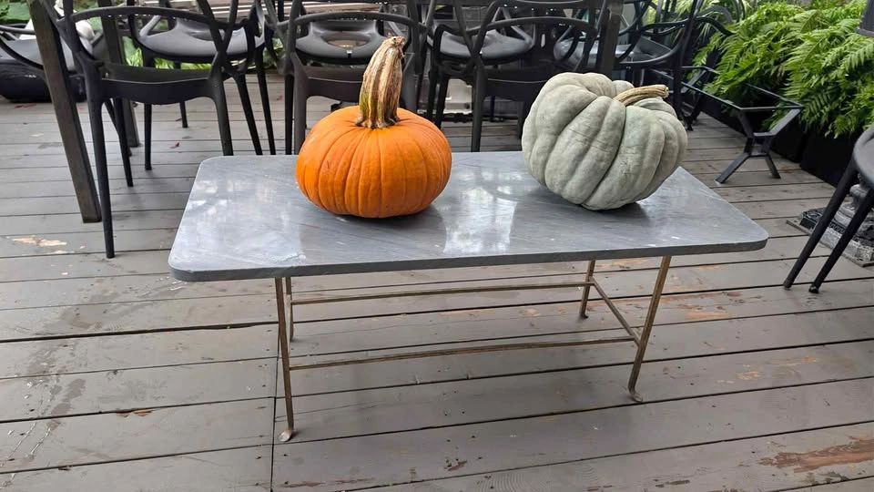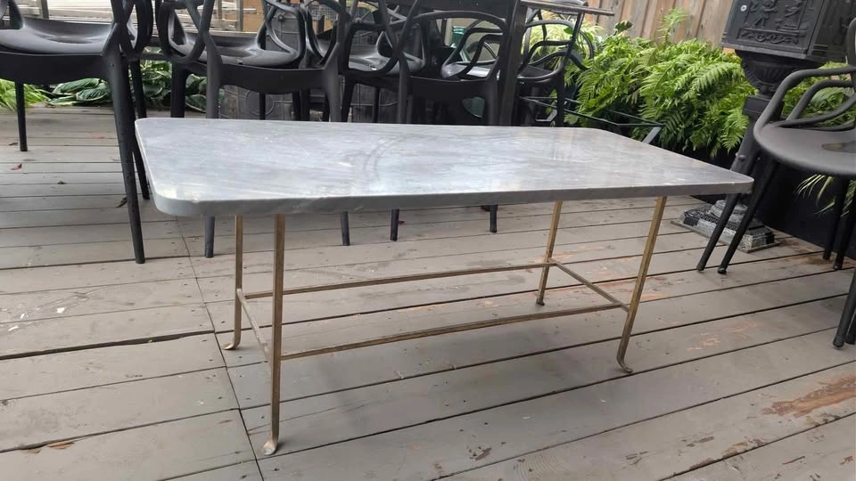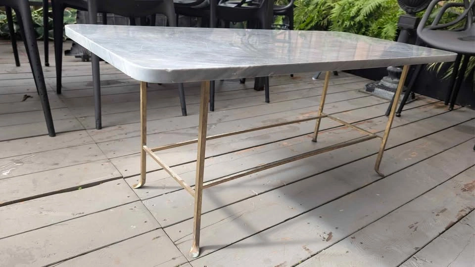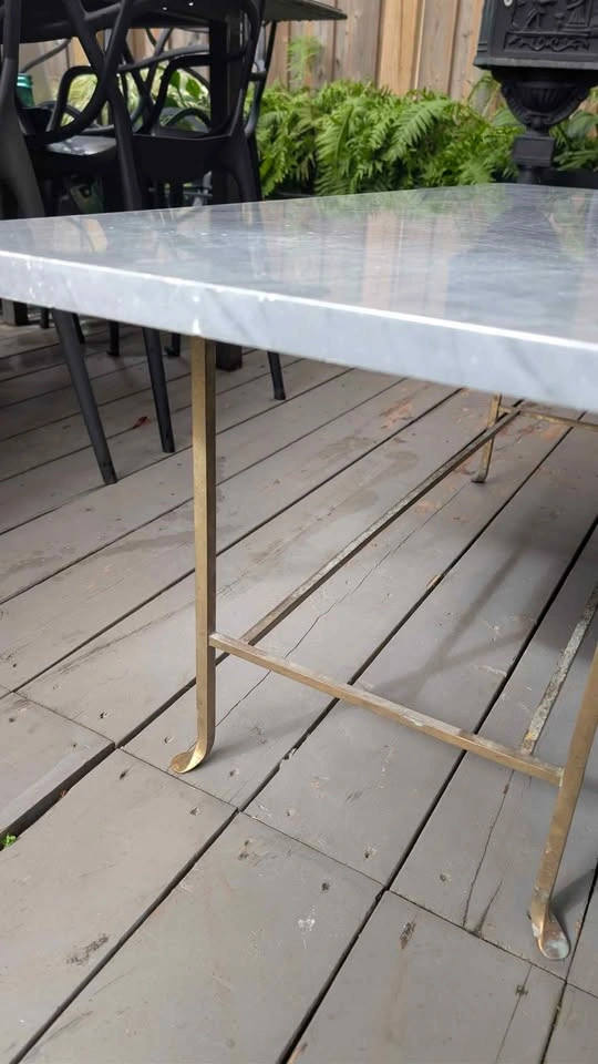 A rectangle of beautifully veined grey marble rests on a slim, minimalist frame finished in a warm, unlacquered brass. We love the subtle details, like the delicately curved spade feet that add a touch of mid-century refinement. The open, airy design keeps it from feeling heavy, making it ideal for both grand spaces and intimate outdoor lounges. Each marble top is one-of-a-kind, showcasing unique patterns and color variations that are part of its natural beauty.
