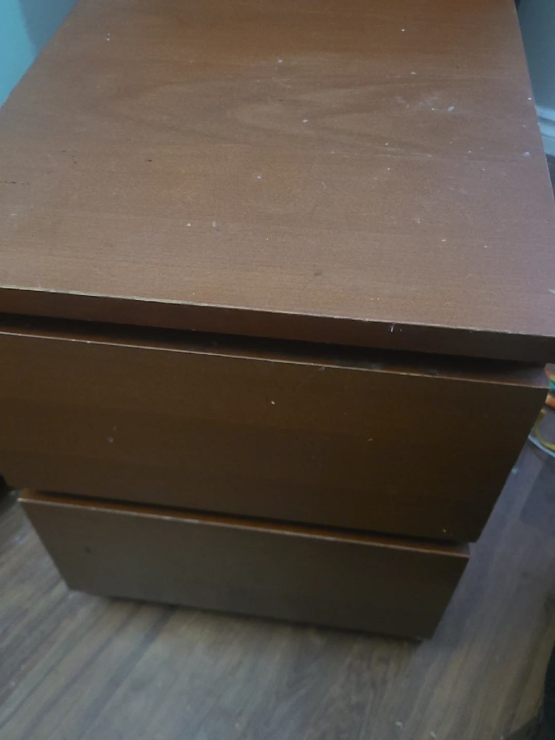 Here's a wooden dresser with three drawers. It's perfect for adding some extra storage to your bedroom or living space