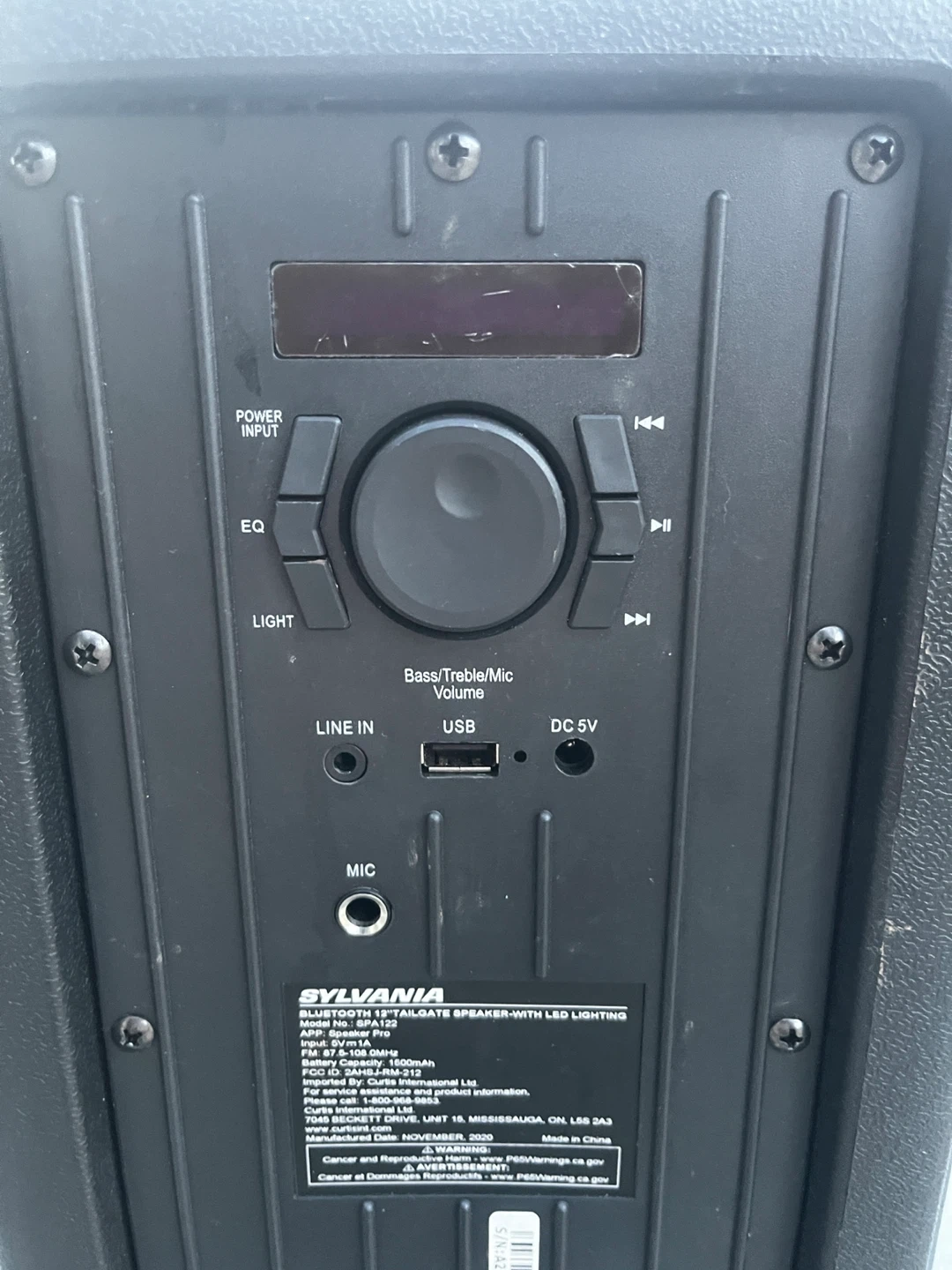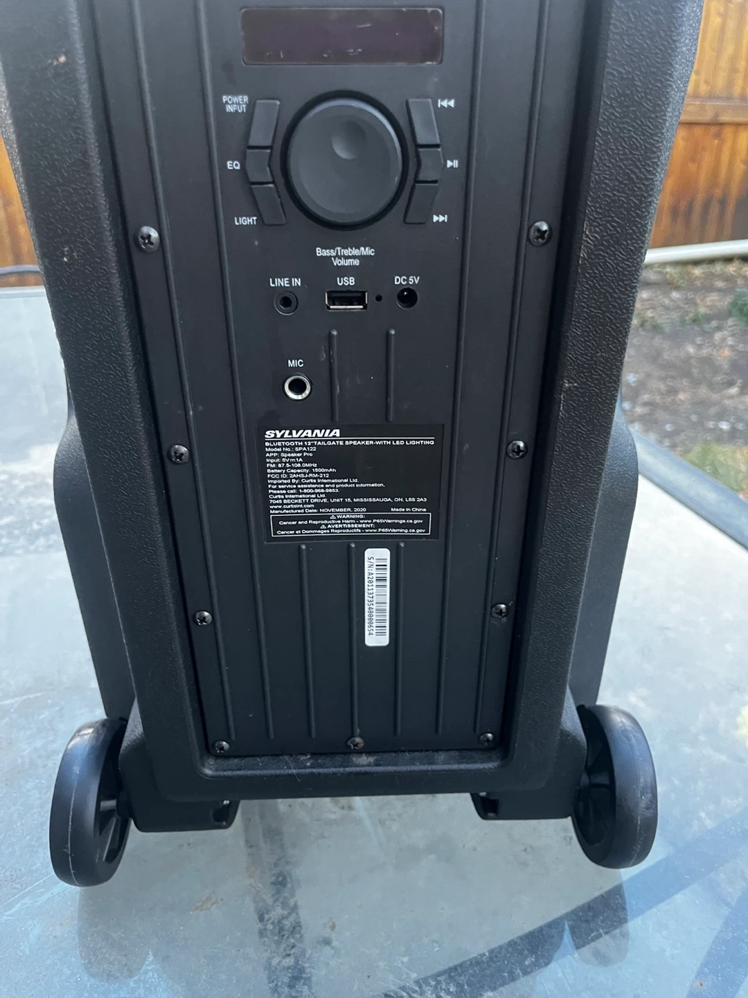 Selling a Sylvania Bluetooth Tailgate Speaker with LED Lighting! It's in great shape and ready to bring the party. It features a telescopic handle and wheels for easy transport, plus it has a USB input and microphone input for ultimate flexibility. Missing charger.
