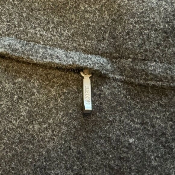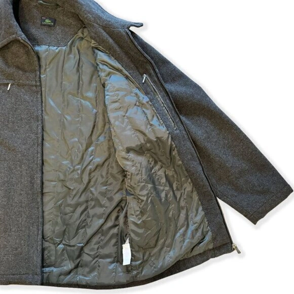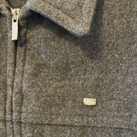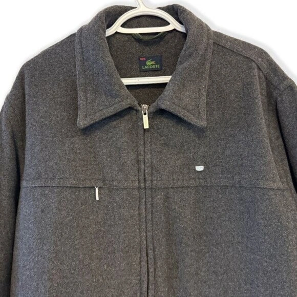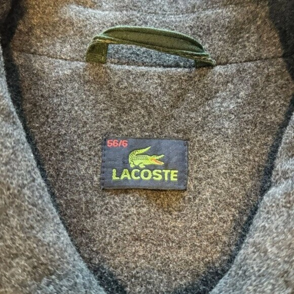 48A classic vintage Lacoste wool zip-up jacket made in France, perfect for easy, everyday layering. The neutral grey tone and minimalist design give it a timeless, quiet-luxury feel — effortless, clean, and wearable with anything. The relaxed fit works well as a shacket (shirt-jacket style) over knits, tees, or button-downs. Warm but not bulky, ideal for fall through early winter. Details - Vintage late 90s / early 2000s - Lacoste - Wool blend shell - Full zip front - Interior + exterior pockets - Made in France - Unisex fit - Excellent vintage condition Size: 56/6 typically corresponds to about a man’s size XL; refer to measurements. Approximate Measurements: - Pit to Pit: 26” - Shoulder: 20” - Sleeve: 25” - Length: 30.5” All measurements are taken flat. Compare these measurements to your existing clothing for the best fit. Great for minimalist, normcore, academia, and quiet-luxury inspired wardrobes.