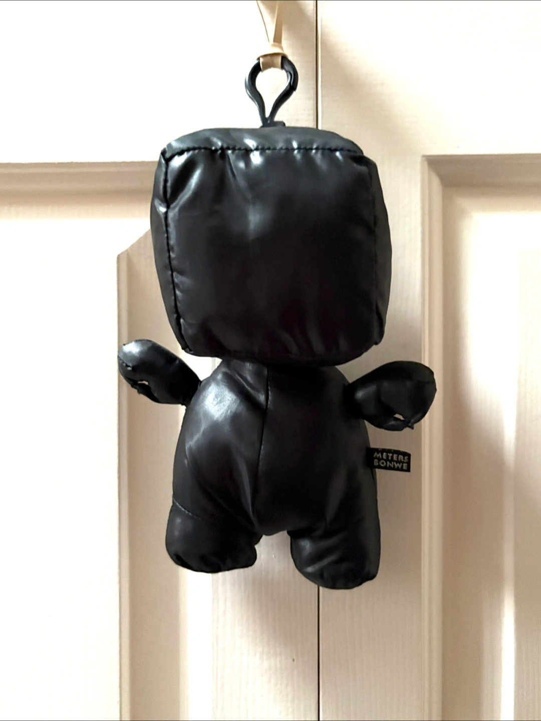 It's in black and can be transformed from a doll into a shopping bag and back again.