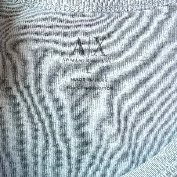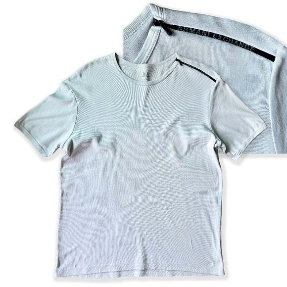 48Add a unique piece to your wardrobe with this vintage 2000s Armani Exchange t-shirt in a stylish blue-grey shade. Made in Peru from 100% premium Pima cotton, this t-shirt offers a soft, breathable feel with a luxurious touch. It features a zipper detail on the right shoulder, subtly branded with 'Armani Exchange,' adding a distinctive edge to this classic tee. The relaxed fit and minimalist design make it perfect for casual, everyday wear. Features: - Vintage from the 2000s - Brand: Armani Exchange - Color: Blue-grey (soft, neutral tone) - Material: 100% Pima cotton, made in Peru - Unique Detail: Zipper on right shoulder with 'Armani Exchange' branding - Fit: Relaxed, comfortable style - Good vintage condition Size: Large, fits closer to a size medium Approximate Measurements: - Pit to Pit: 20 inches - Length: 25 inches ***All measurements are taken flat. Compare these measurements to your existing clothing for the best fit. This versatile t-shirt pairs effortlessly with jeans, shorts or layered under jackets for a stylish, laid-back look.