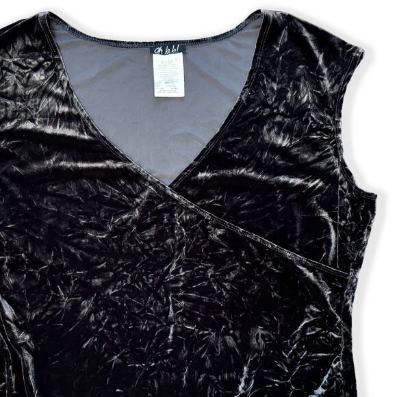 Vintage 90s Y2K crushed velvet short sleeve top, perfect for fall fashion, holiday parties, or grunge-inspired looks. Made in Canada by Oh! La La!, this chic grey top features a flattering surplice wrap neckline and a soft crushed velvet texture, embodying both sophistication and edgy Y2K vibes.