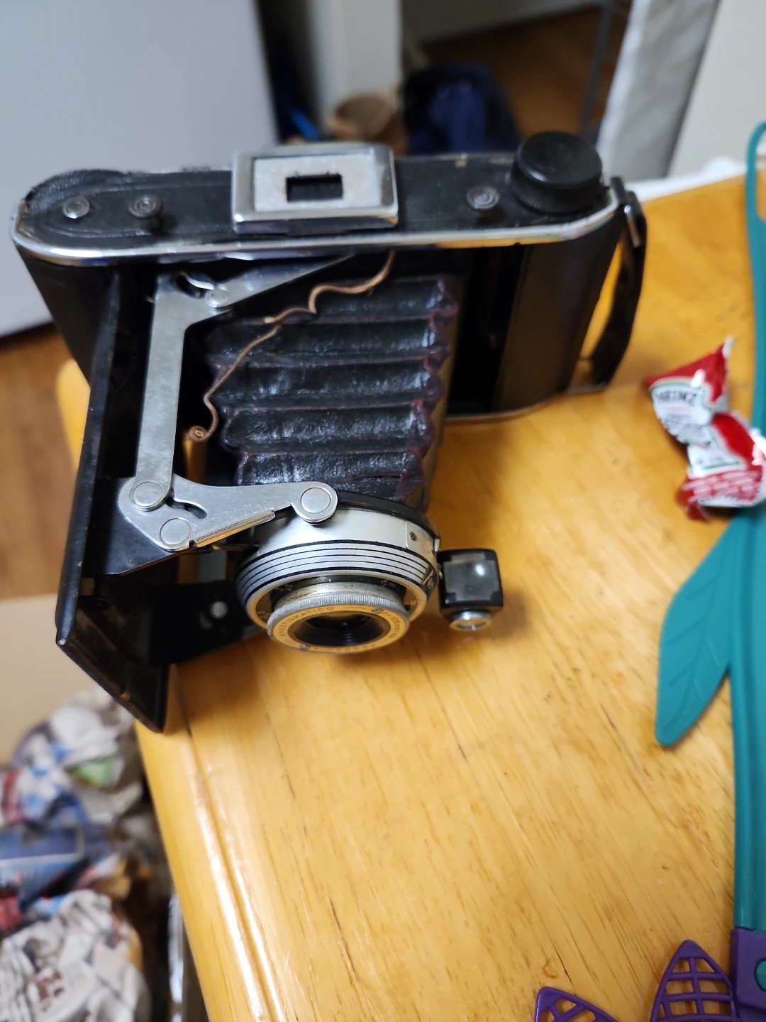 Selling a vintage folding camera. It shows signs of wear typical for its age, but it's a cool piece of history! The bellows appear to be in decent shape, and the lens is intact. Great for collectors or as a decorative item