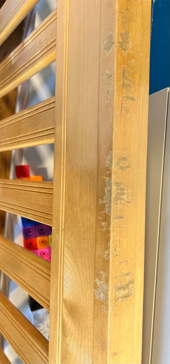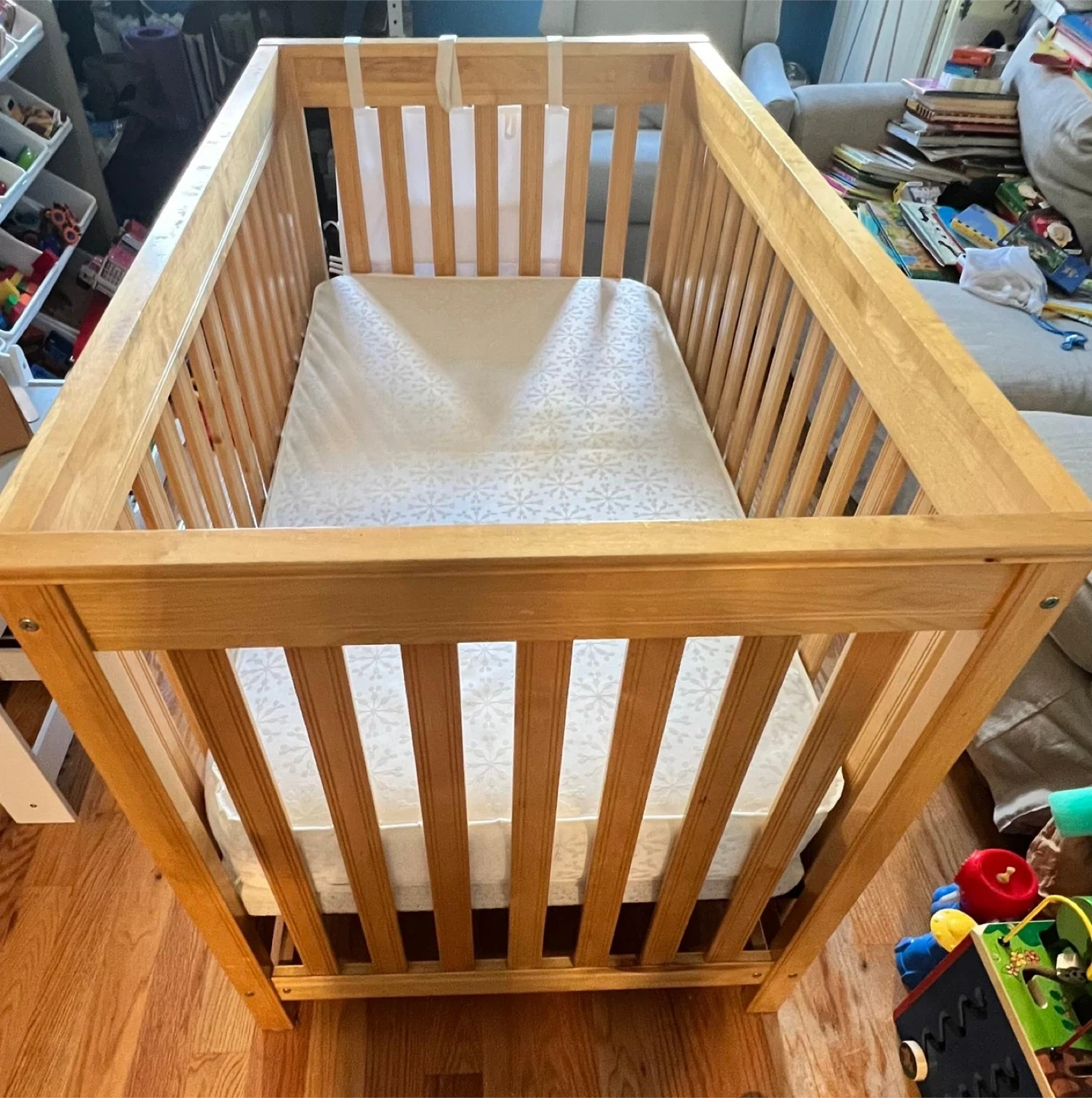 Selling a convertible wooden baby crib. It has some signs of use, as pictured. This crib is designed to accommodate mattresses with a thickness not exceeding 6 inches. The mattress size should be at least 27-1/4 inches by 51-3/4 inches.