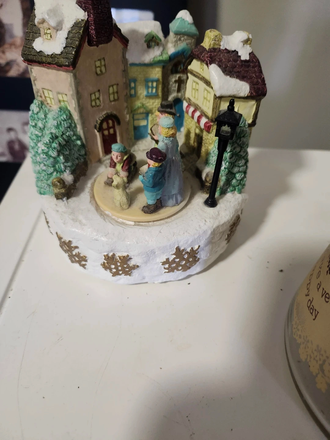 A charming Christmas village scene decoration, perfect for adding a festive touch to your home this holiday season! It features detailed figurines and buildings on a snow-covered base with snowflake accents