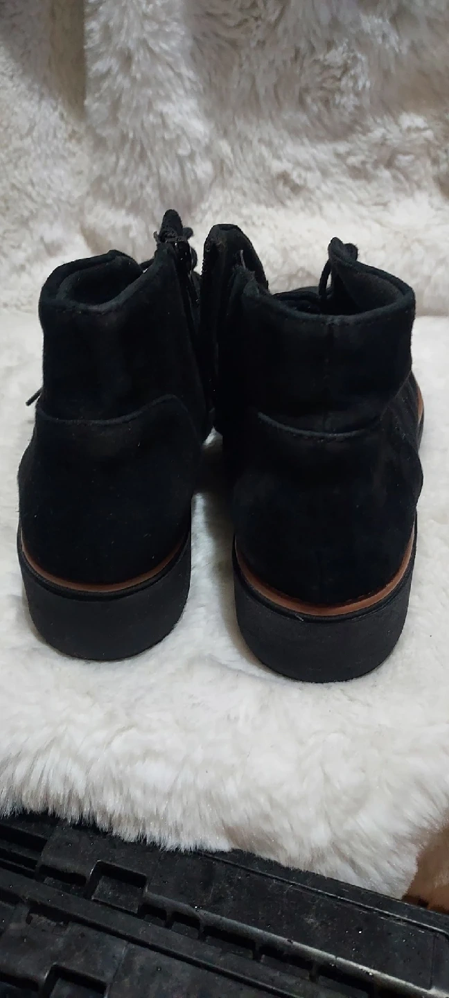 These are a pair of Clarks ankle boots in black suede. They feature a lace-up design with a side zipper for easy wear. The sole has a contrasting brown accent. These boots are perfect for adding a touch of style to your everyday look!