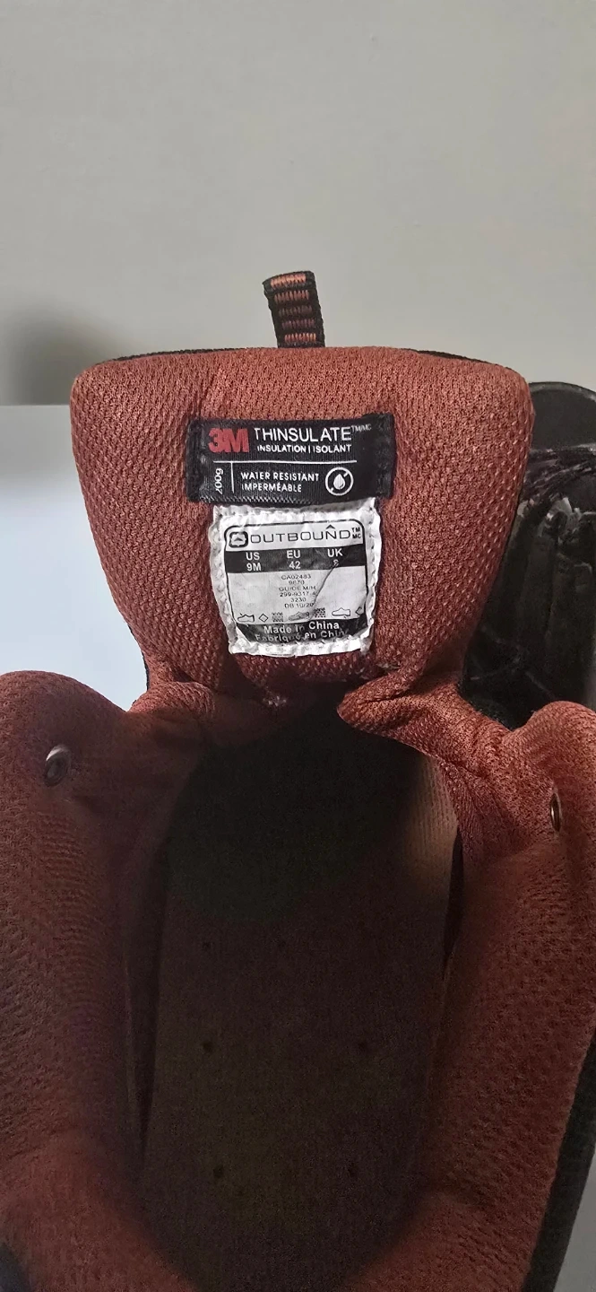 Selling a pair of Outbound men's hiking boots. They are a size 9M and feature 3M Thinsulate insulation for warmth and are water resistant. Great for hiking or outdoor activities!