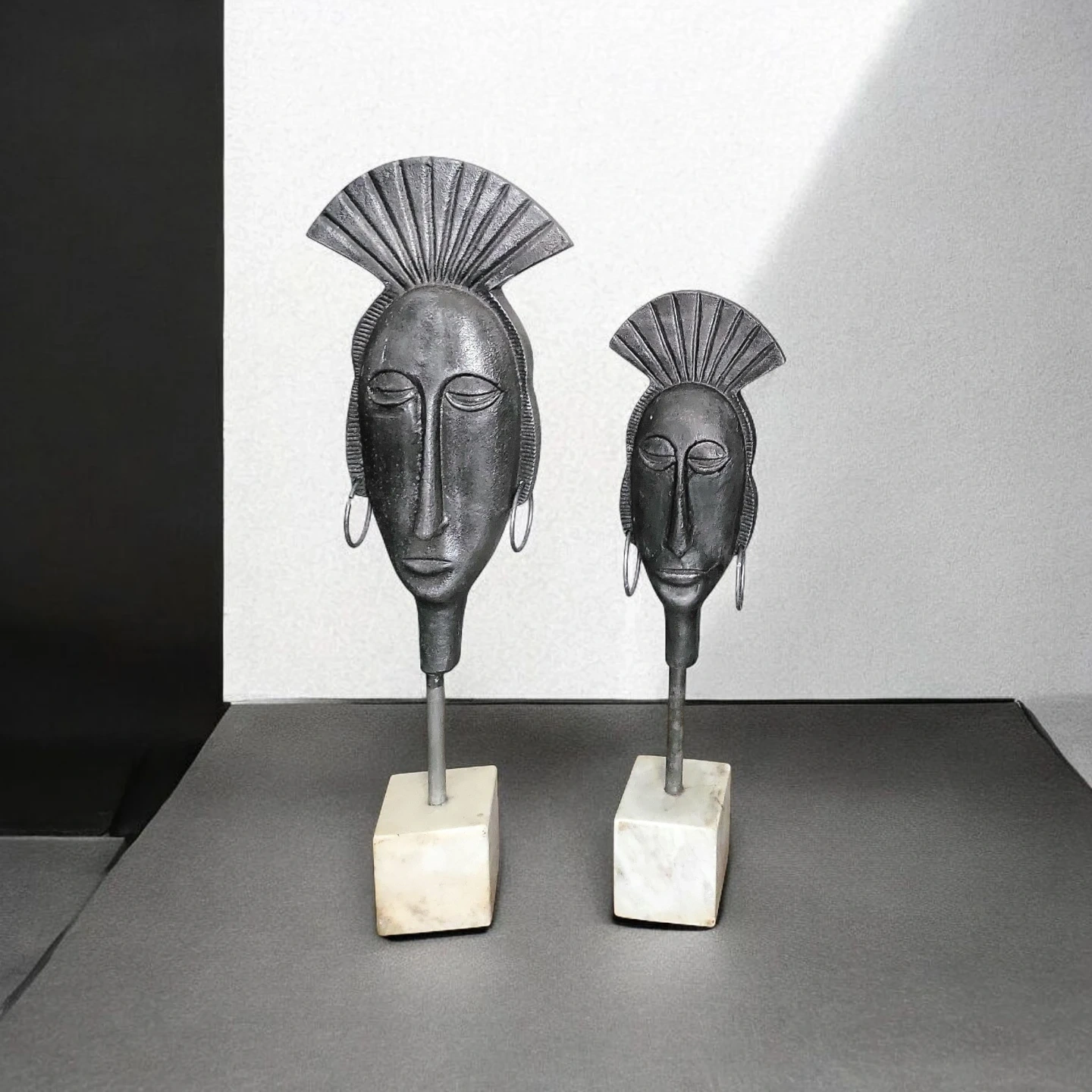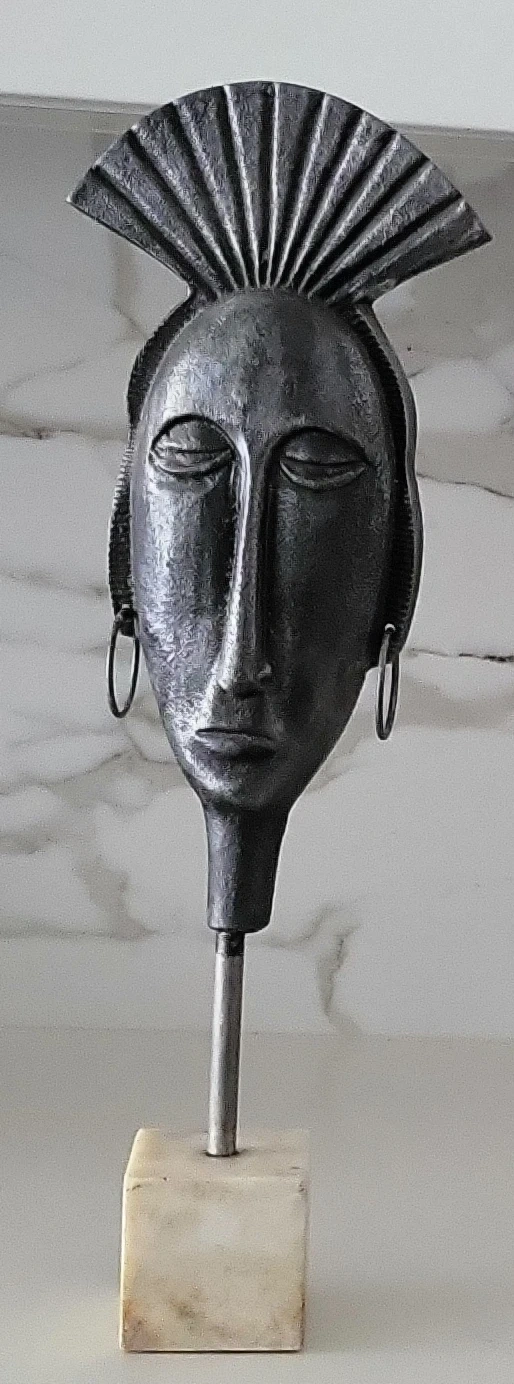 Selling a set of two unique metal face sculptures! They have a cool, artistic vibe and would look great on a shelf or table. The sculptures feature a silver-toned metal finish and are mounted on marble-like bases. They are in great condition and ready to add some character to your space