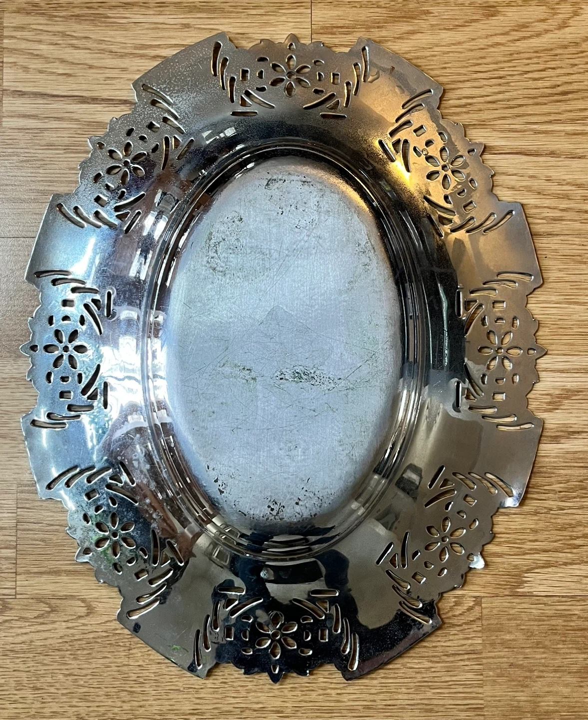 Selling a lovely vintage silver plated serving dish. It has a beautiful ornate design around the edges. Perfect for serving snacks or displaying decorative items!
