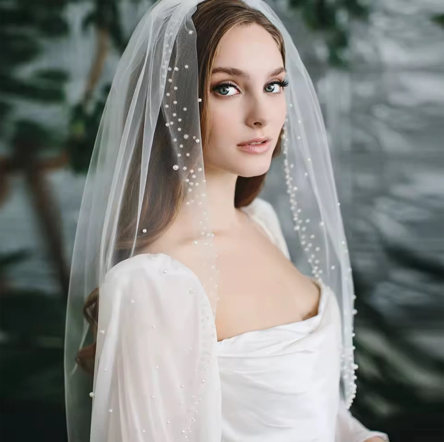 Selling a beautiful white wedding veil adorned with delicate pearls. It's in great condition and perfect for adding a touch of elegance to your special day! The veil includes a comb for easy attachment.