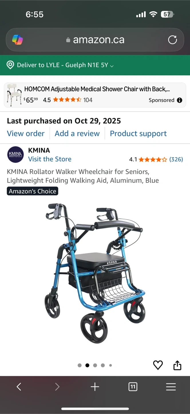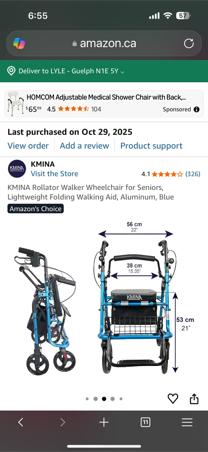 Selling a KMINA rollator walker wheelchair, perfect for seniors! It's a lightweight folding walking aid made of aluminum and comes in a nice blue colour. It’s an Amazon's Choice product, ensuring quality and reliability