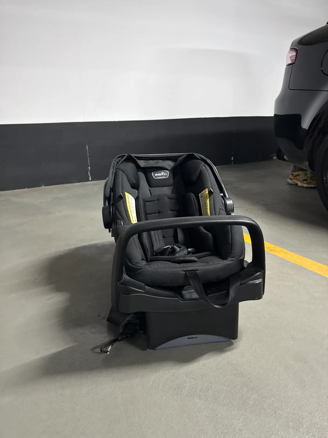 Selling a used Evenflo infant car seat in black. It's in good condition and ready for a new little one. Perfect for keeping your baby safe and secure while on the go!