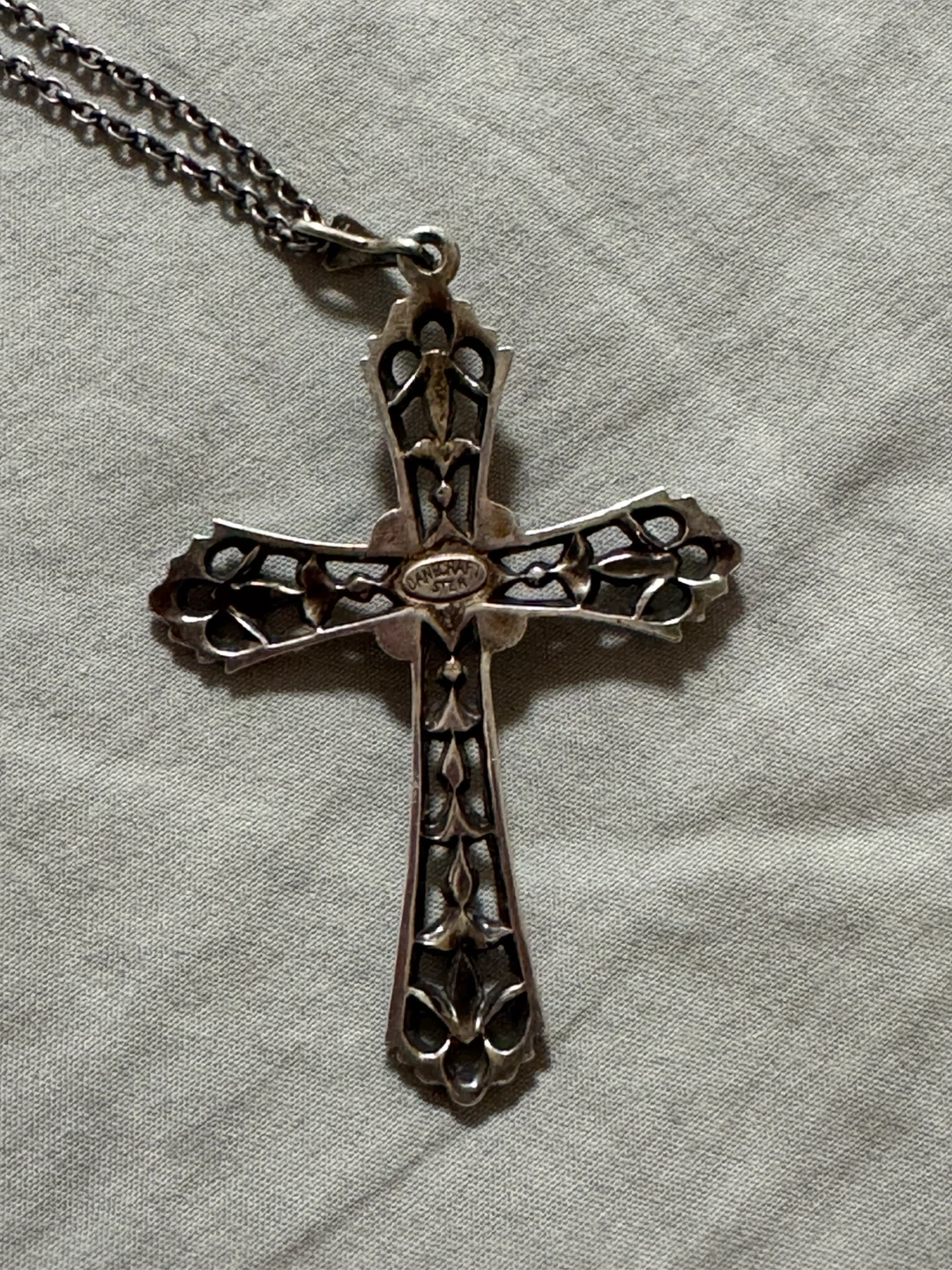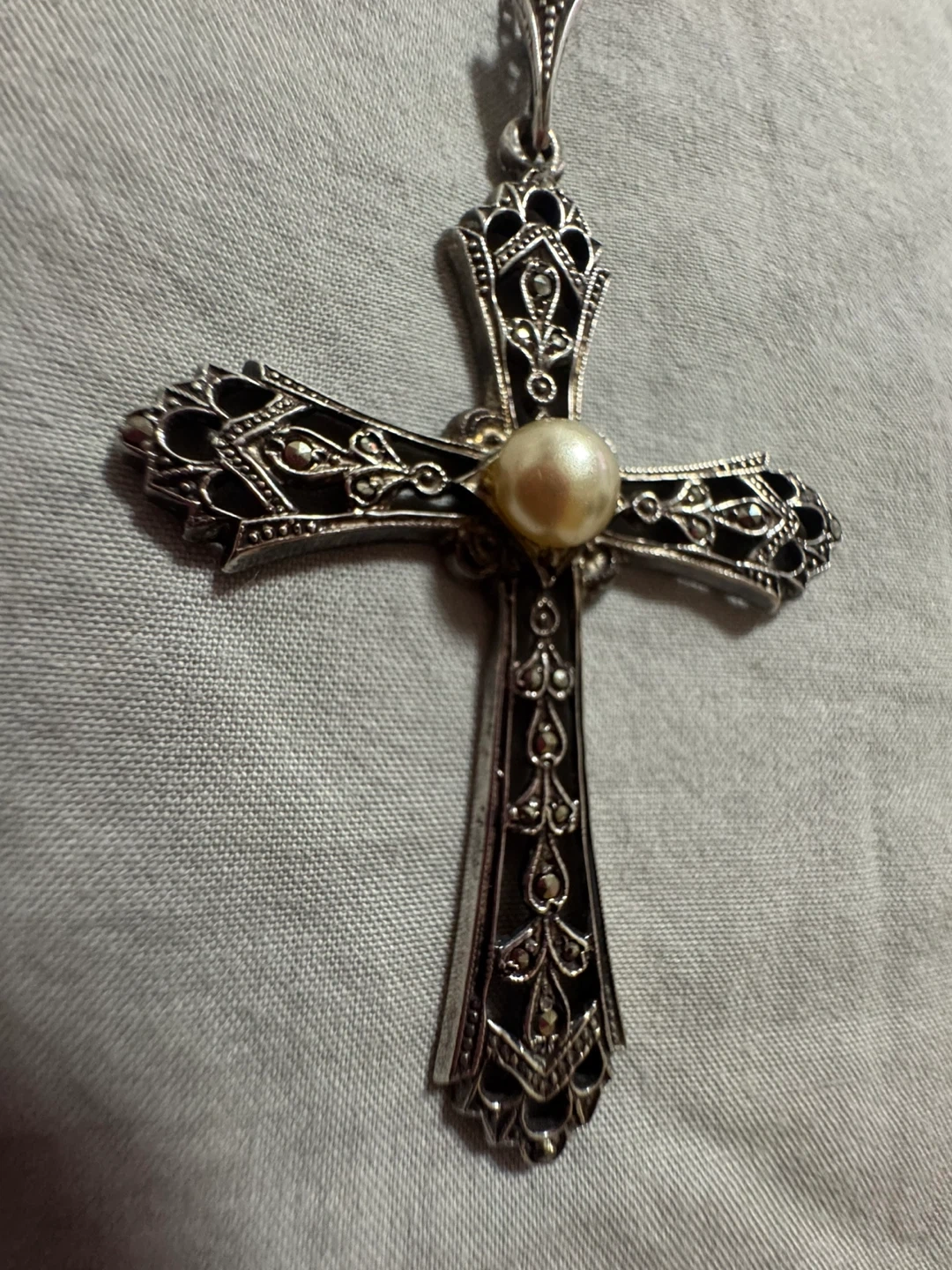 Selling a cross pendant necklace. It features a pearl in the centre of the cross. The chain is included! This piece is sterling silver and a vintage danecraft piece. No stones are missing.