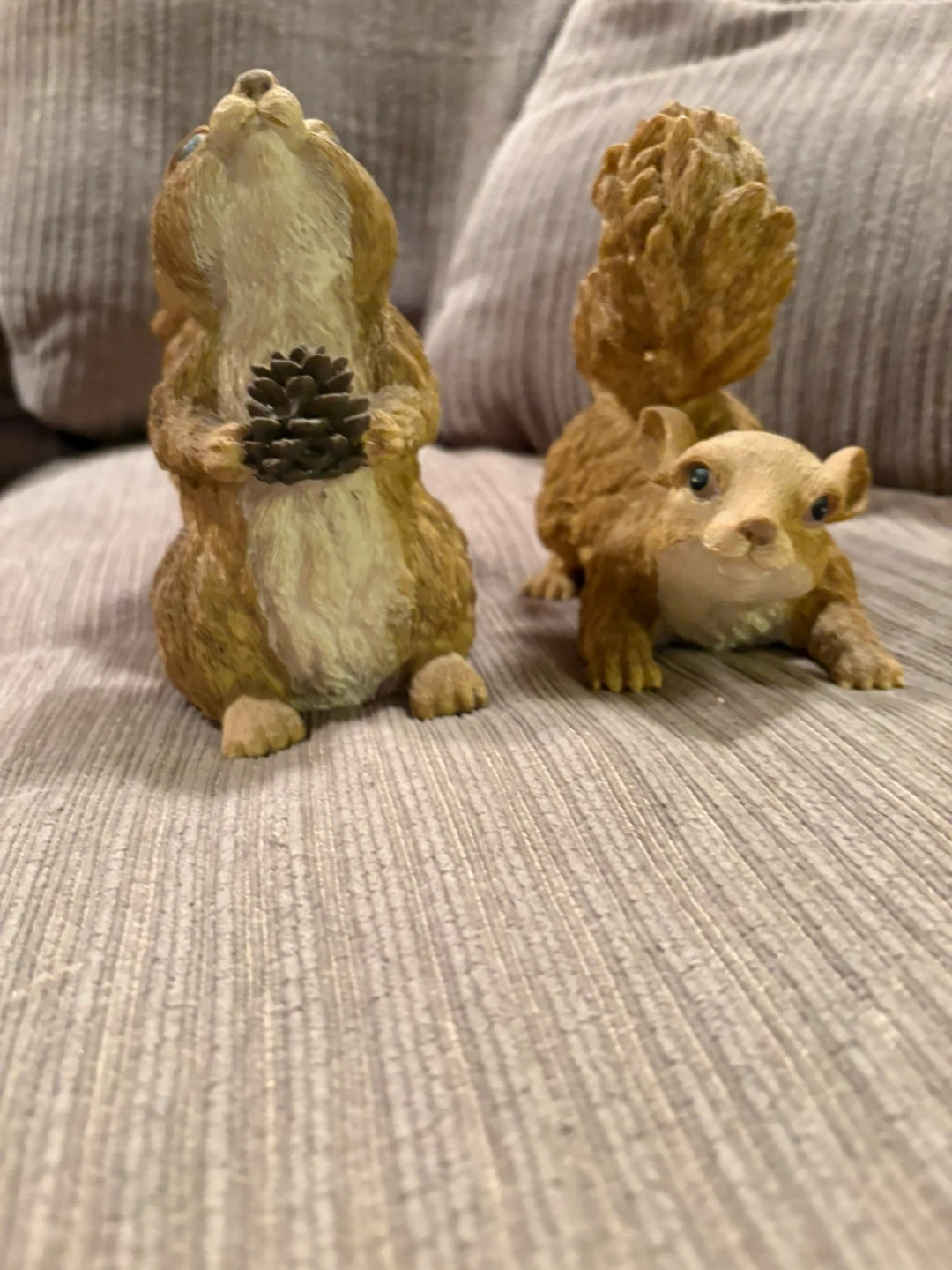 Selling a set of two adorable squirrel figurines. They are in great condition and would look lovely in any home! One squirrel is holding a pine cone, and the other is in a playful pose. They are made of a resin material and are a light brown colour