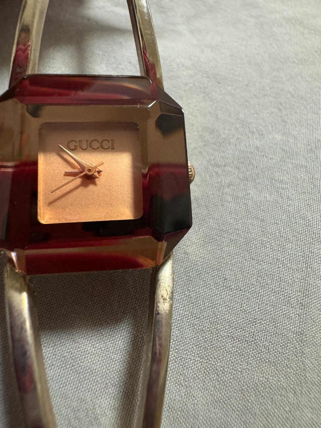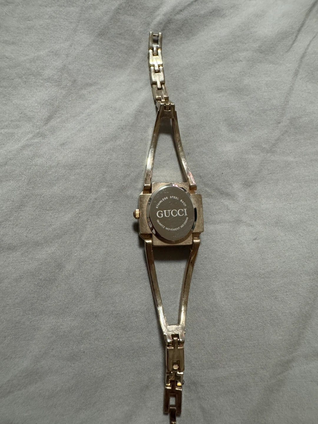 Selling a stylish Gucci ladies watch. It features a unique design and is in good condition. The watch band is stainless steel.