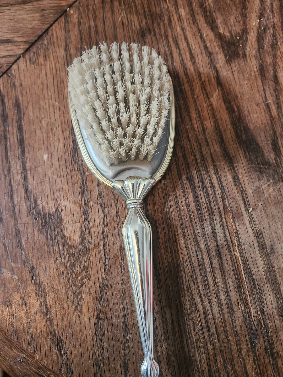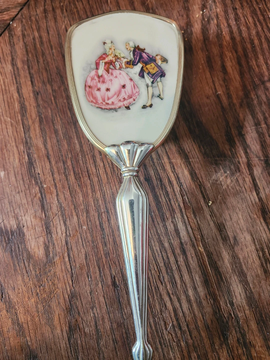 Selling a lovely vintage brush! It has a silver-tone handle and a porcelain back featuring a charming design. It's in great condition and would make a beautiful addition to any vanity or collection