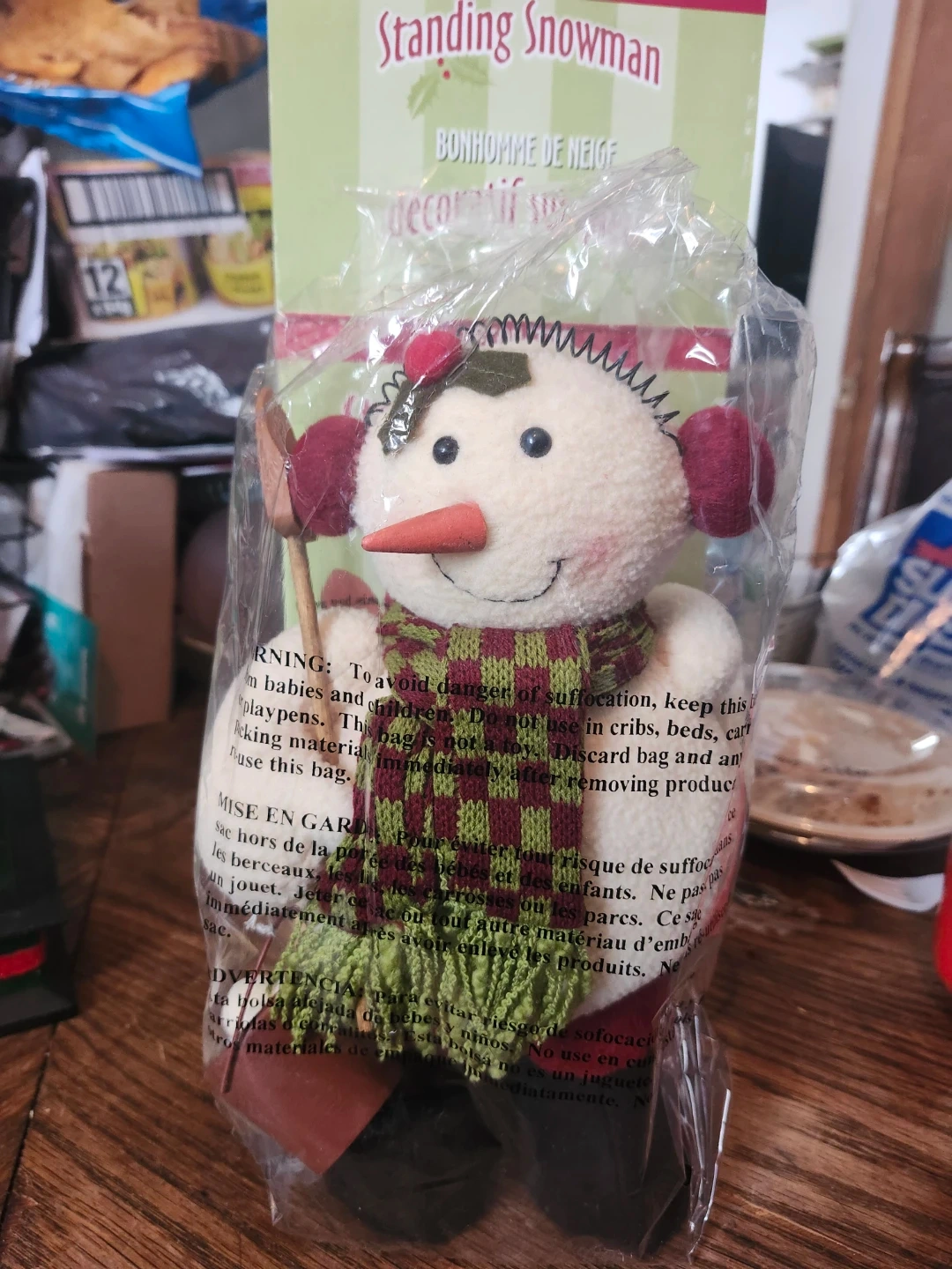 Selling a brand new, still-in-package Decorative Standing Snowman! This adorable snowman is ready to add some festive cheer to your home. It comes in its original packaging, so it's perfect for gifting or keeping for yourself