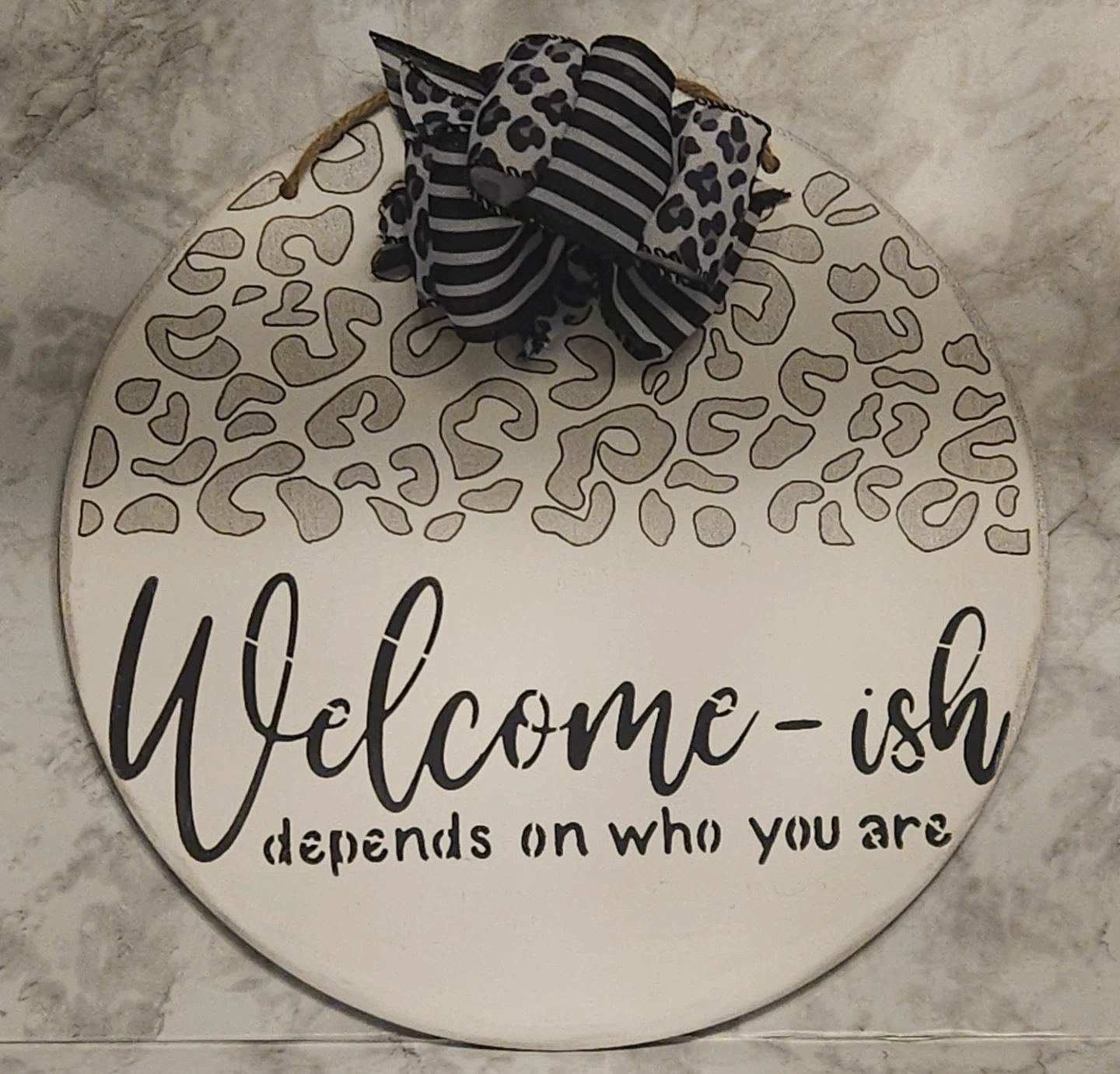 Cute door hanger that says "Welcome-ish depends on who you are"! It has a black and white striped and cheetah print bow on top. 12 Inches.