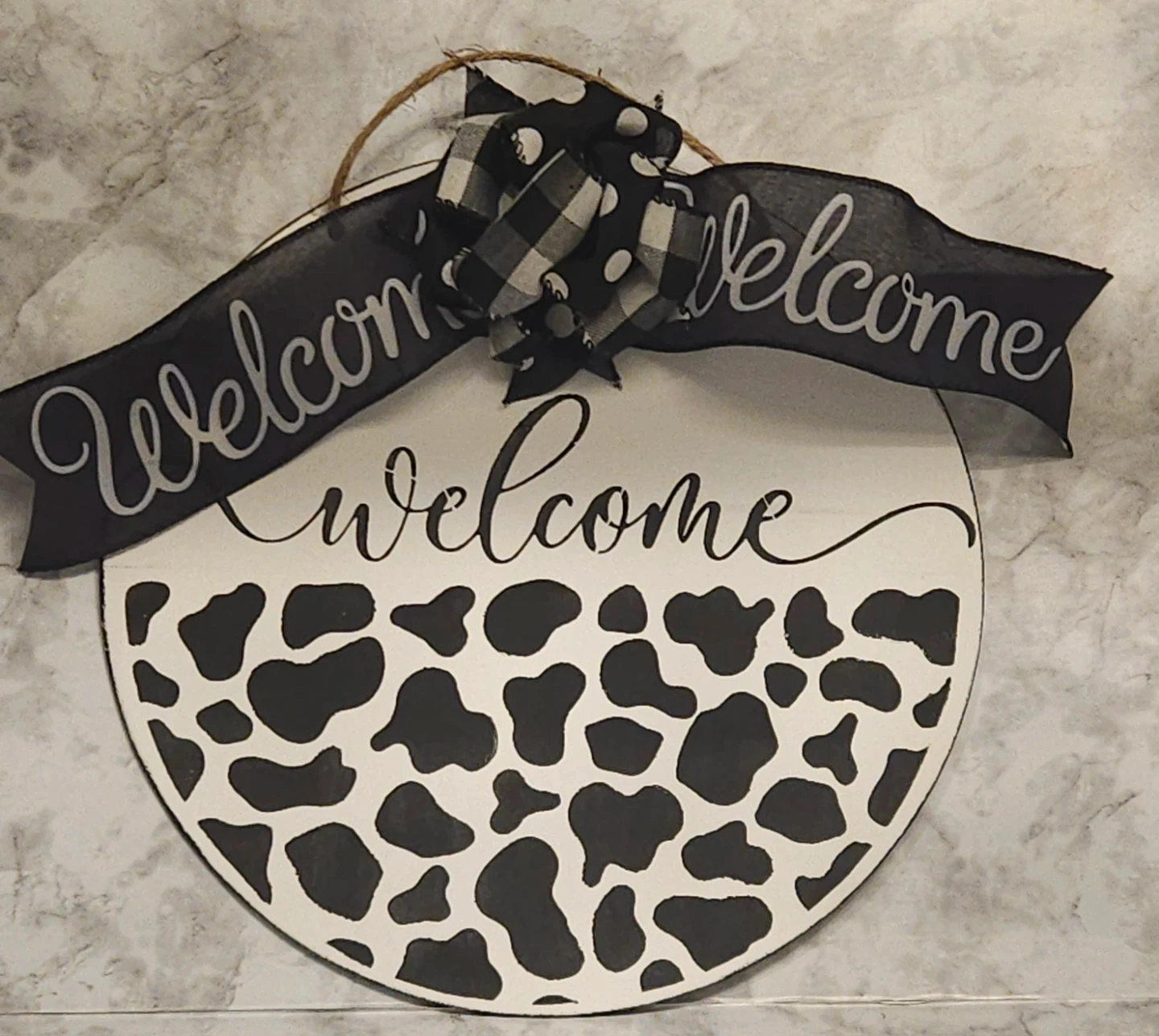10Cute welcome door hanger with a cow print design. Perfect for adding a touch of rustic charm to your home! 12 Inches.