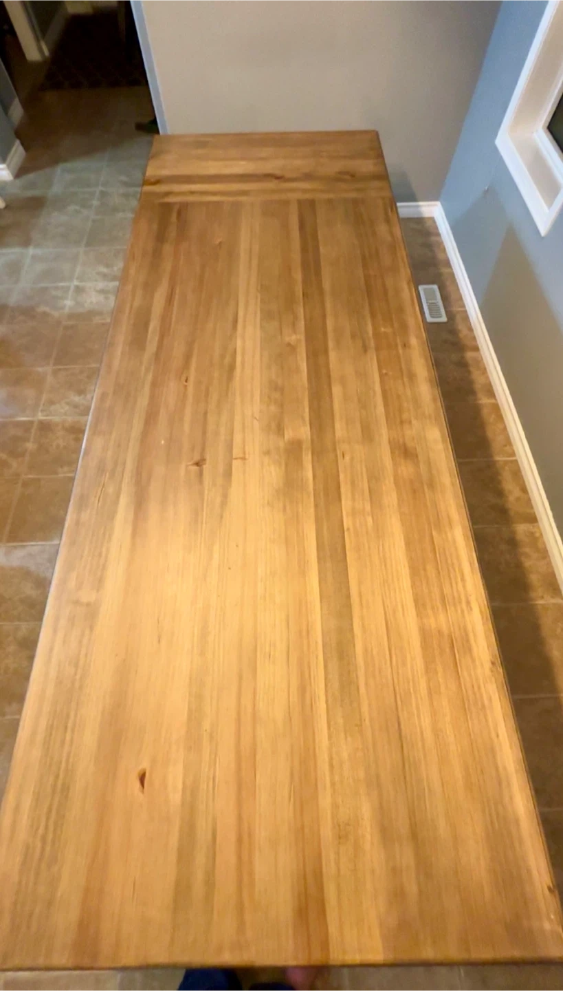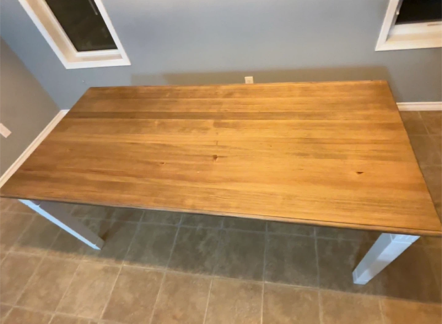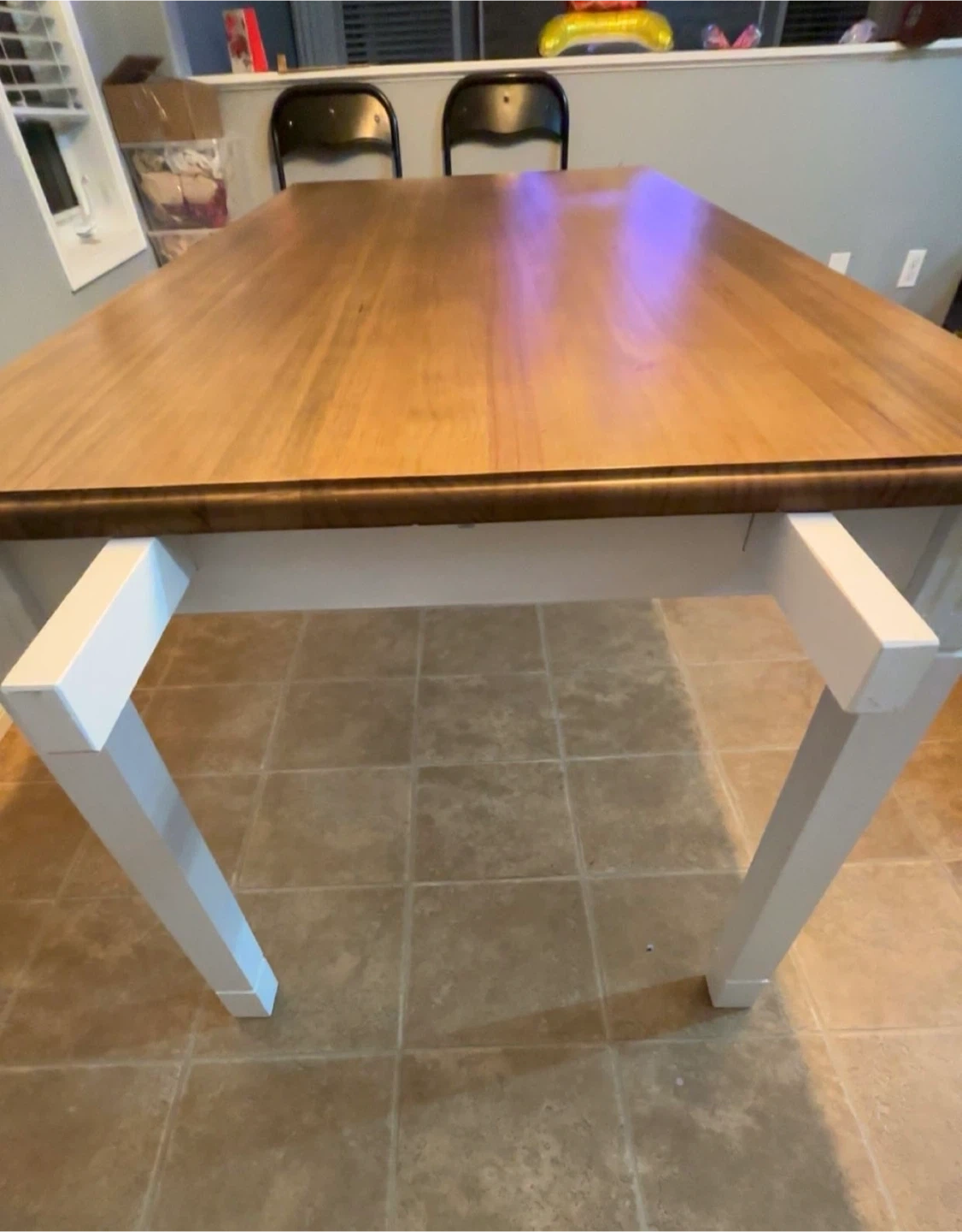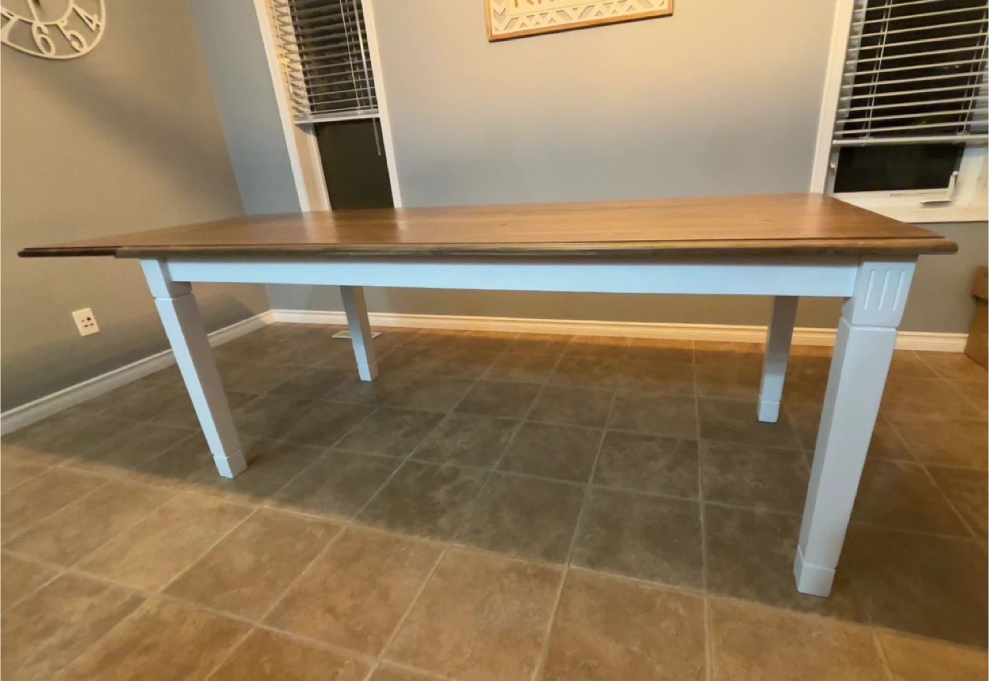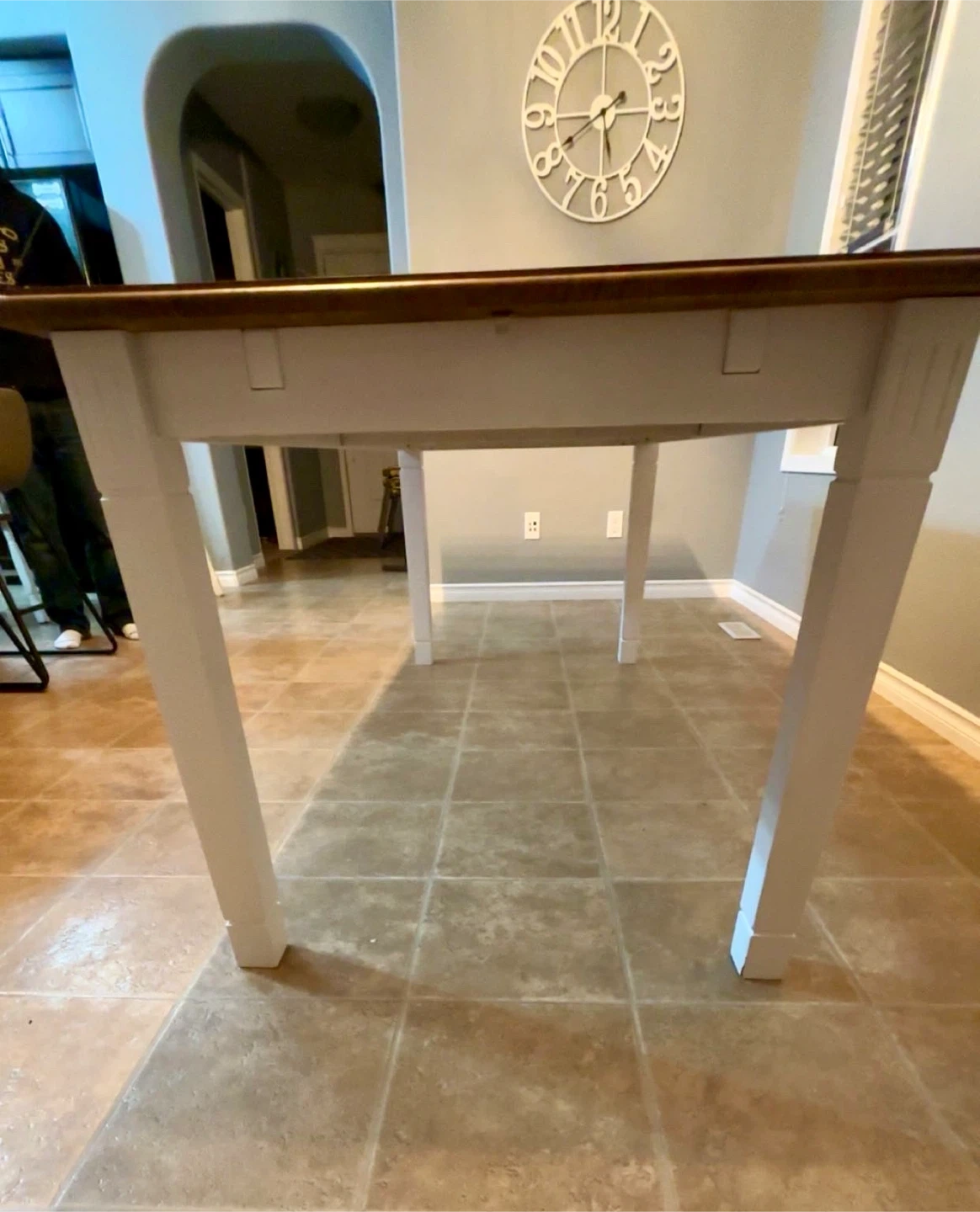 Selling a dining table with a wooden top and white legs. It's in great (like new) condition and would be perfect for a kitchen or dining room. There is also an extender to make it longer. Measurements include with and without extender.