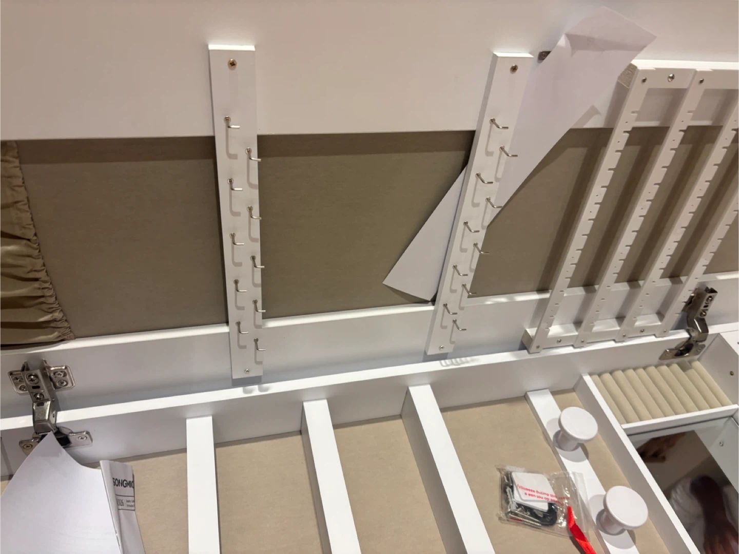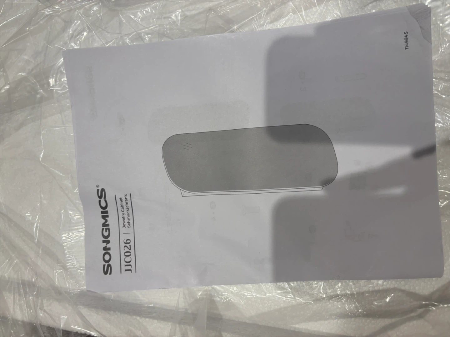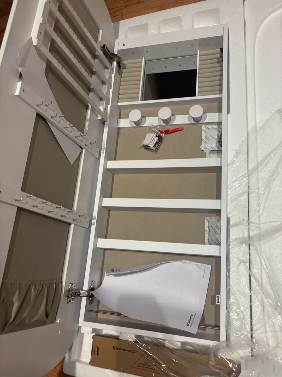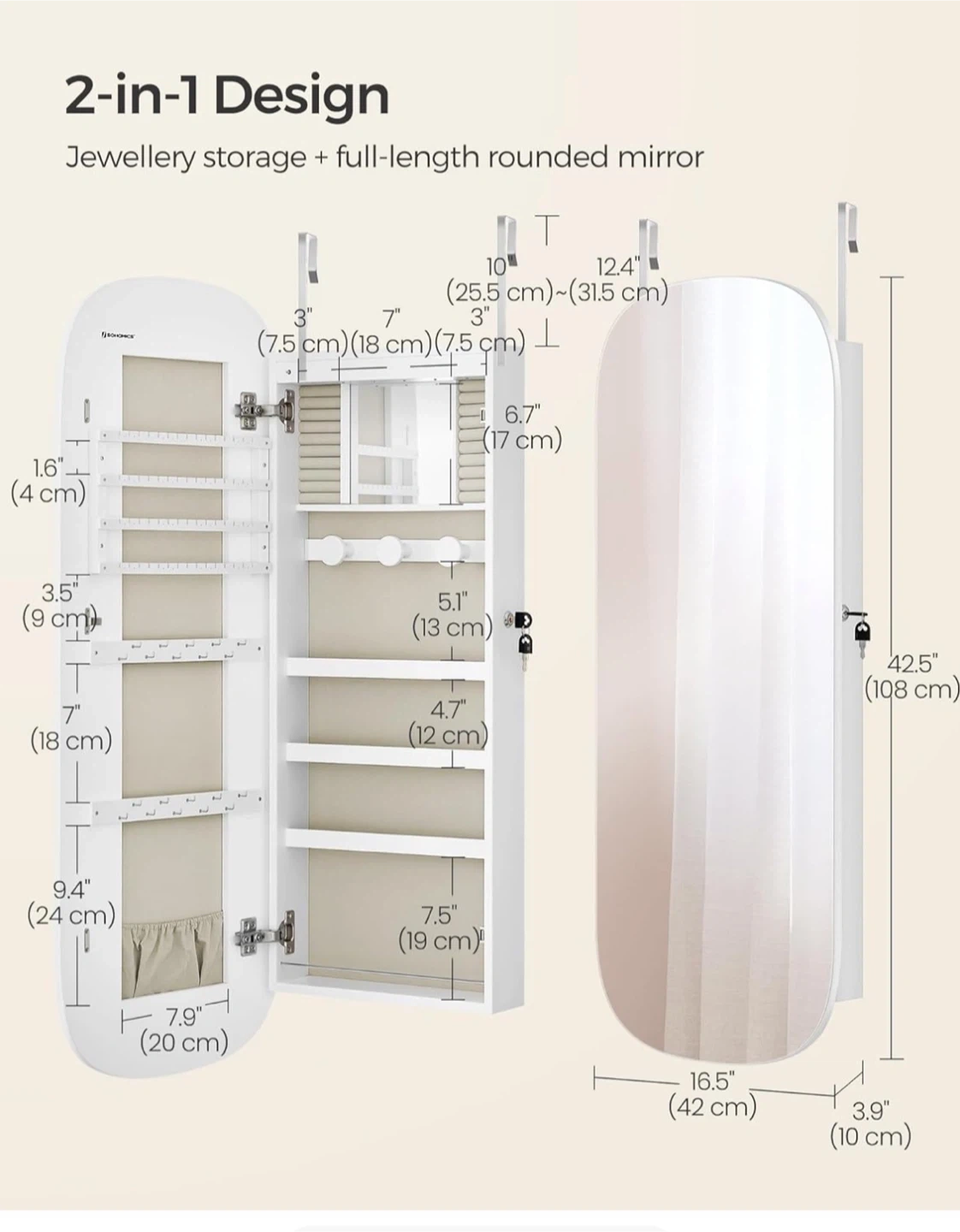 208SONGMICS jewelry cabinet with a full-length rounded mirror! It's a 2-in-1 design, offering both jewelry storage and a mirror. Perfect for keeping your accessories organized and easily accessible. Comes with all components and the box