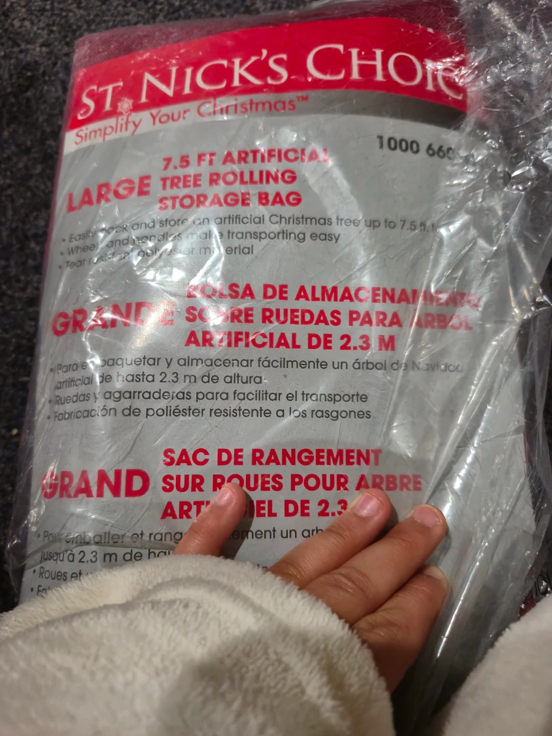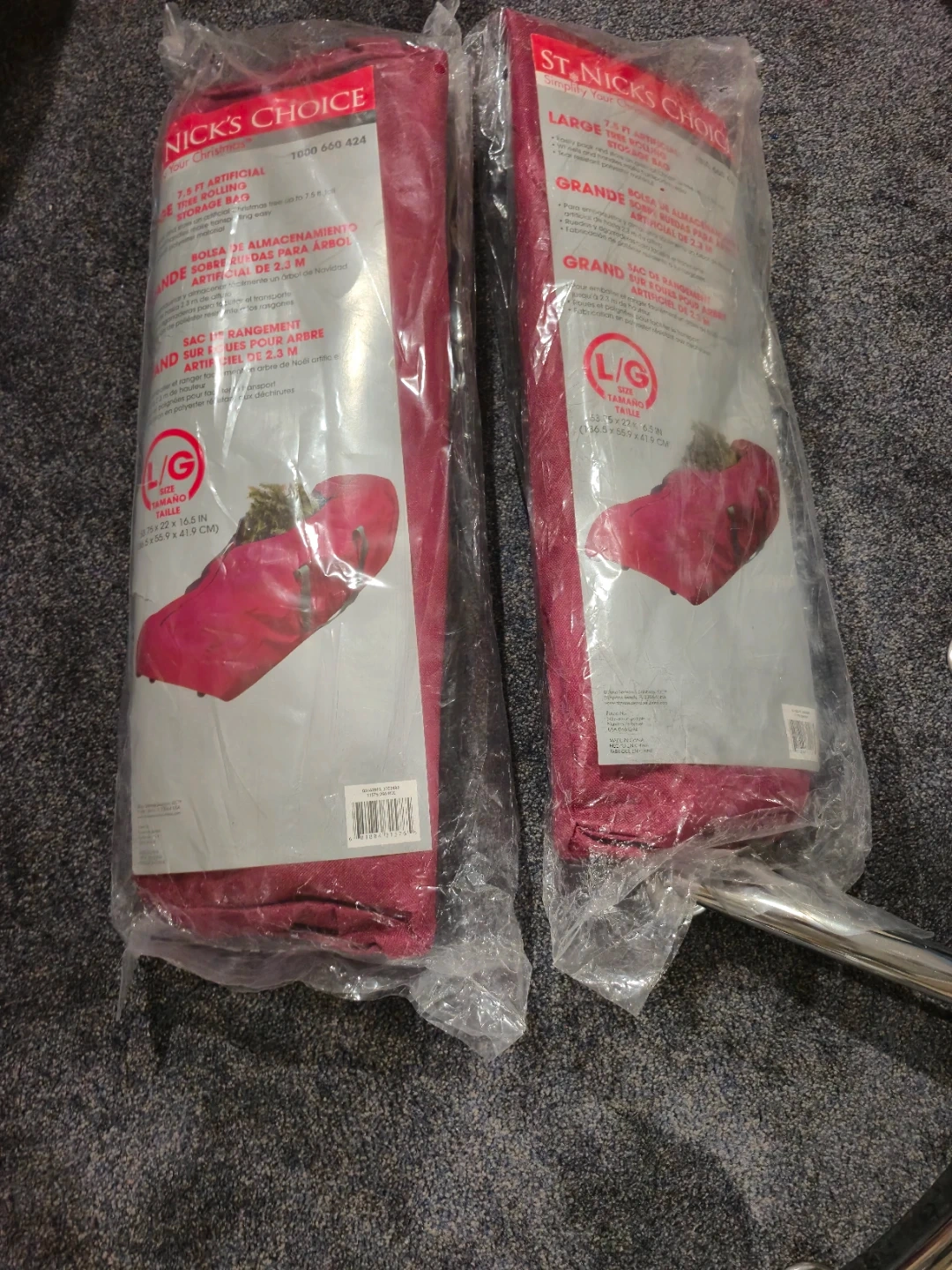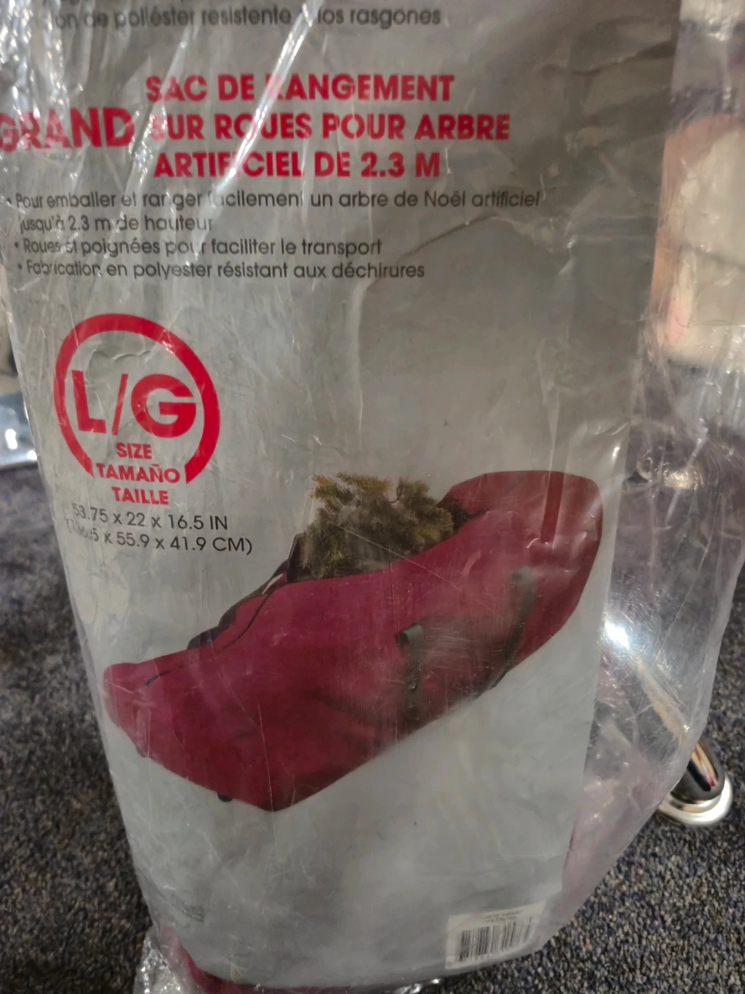 Selling a large St. Nick's Choice rolling tree storage bag. It's designed to easily pack and store an artificial Christmas tree up to 7.5 ft tall. The bag includes wheels and handles for easy transporting, and is made of tear-resistant polyester material. The size is 53.75 x 22 x 16.5 inches (136.5 x 55.9 x 41.9 cm).