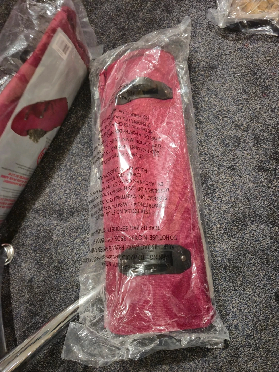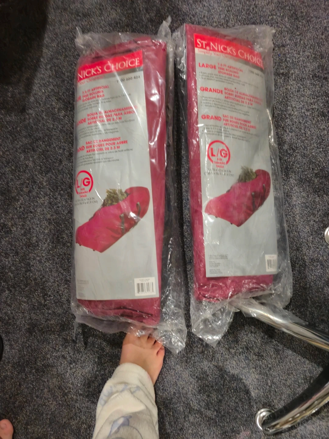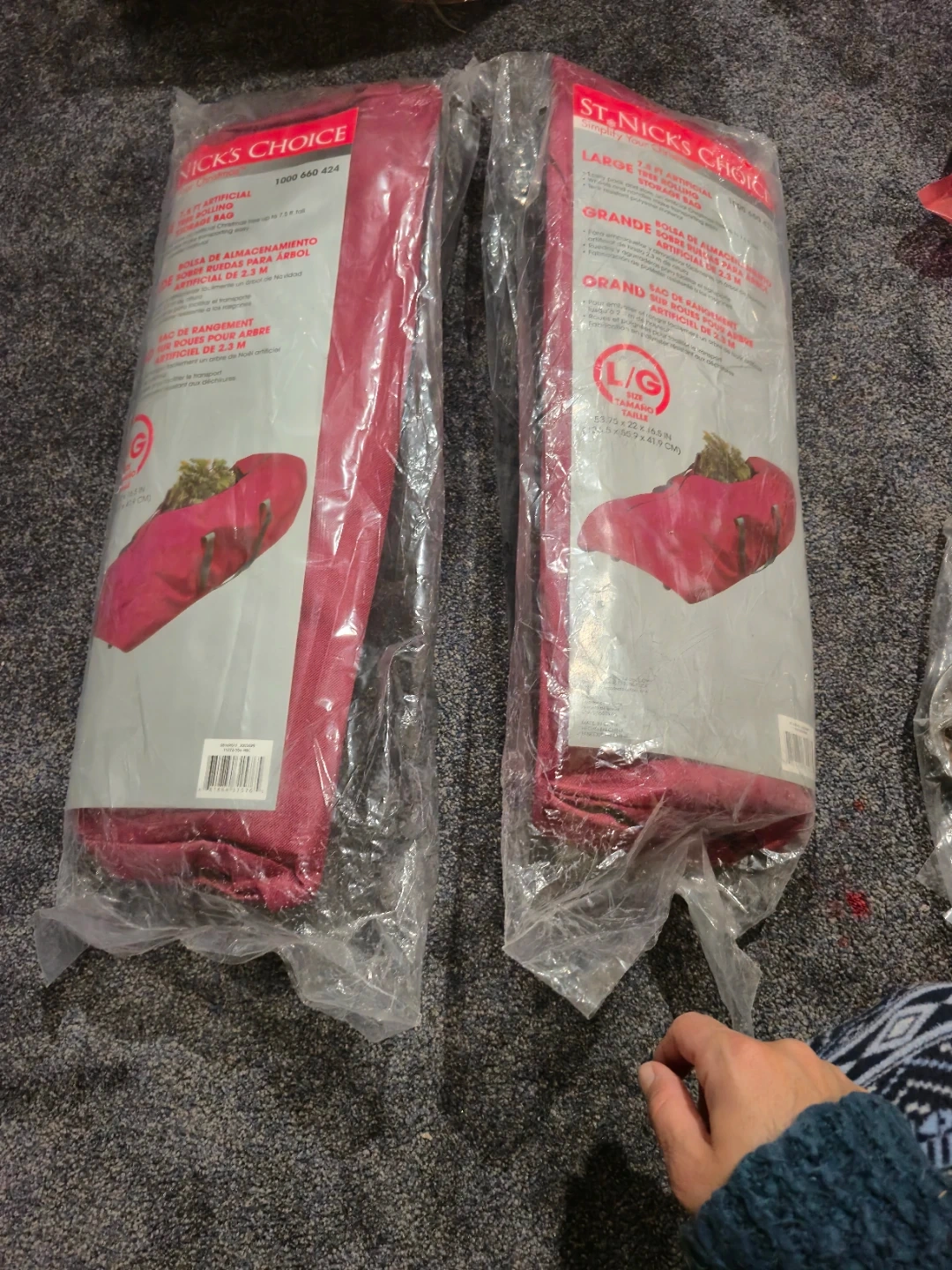 Selling a large St. Nick's Choice rolling tree storage bag. It's designed to easily pack and store an artificial Christmas tree up to 7.5 ft tall. The bag includes wheels and handles for easy transporting, and is made of tear-resistant polyester material. The size is 53.75 x 22 x 16.5 inches (136.5 x 55.9 x 41.9 cm).