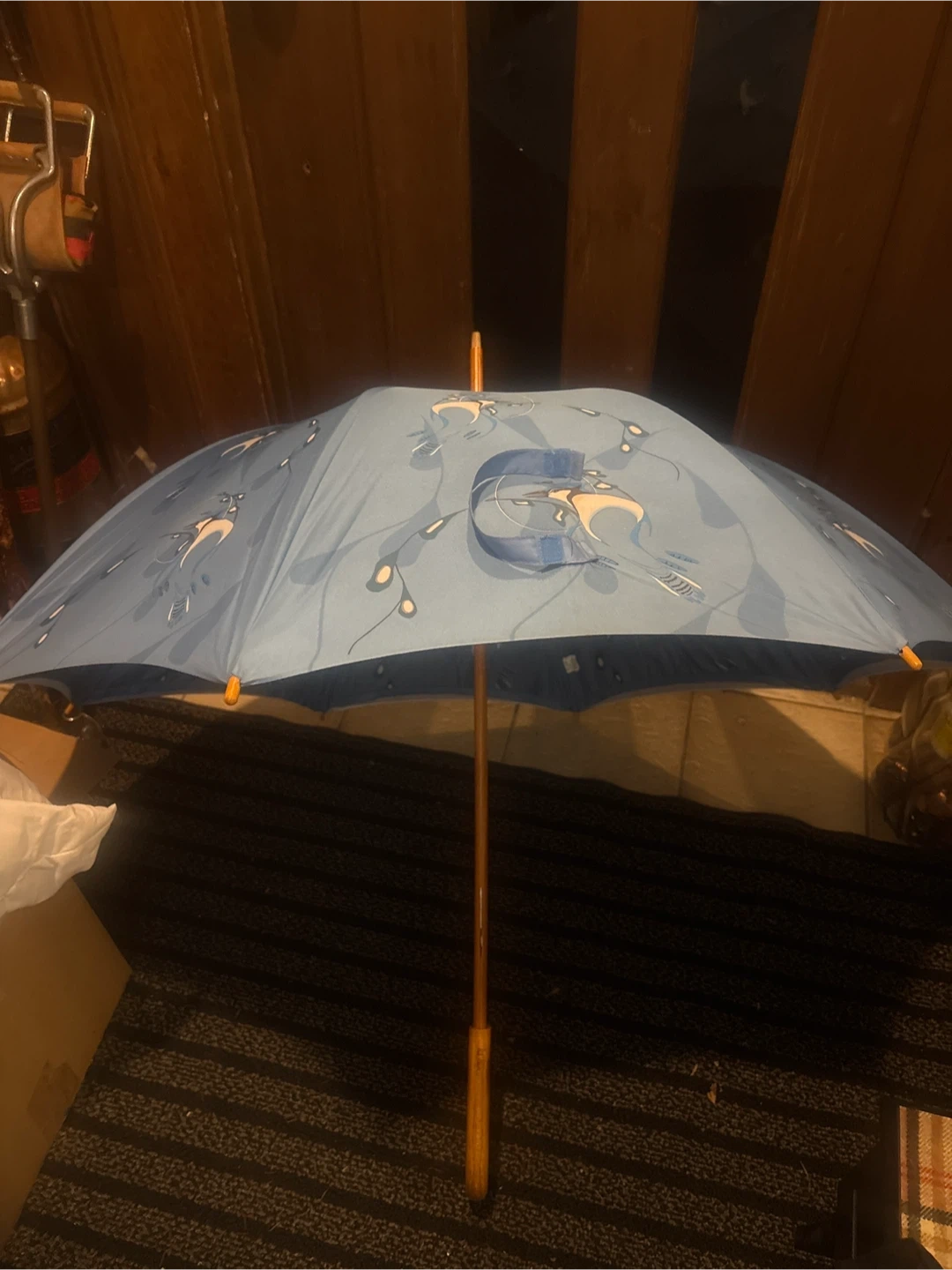 Selling a blue umbrella with a unique pattern! It's in great shape and ready to keep you dry on those rainy days