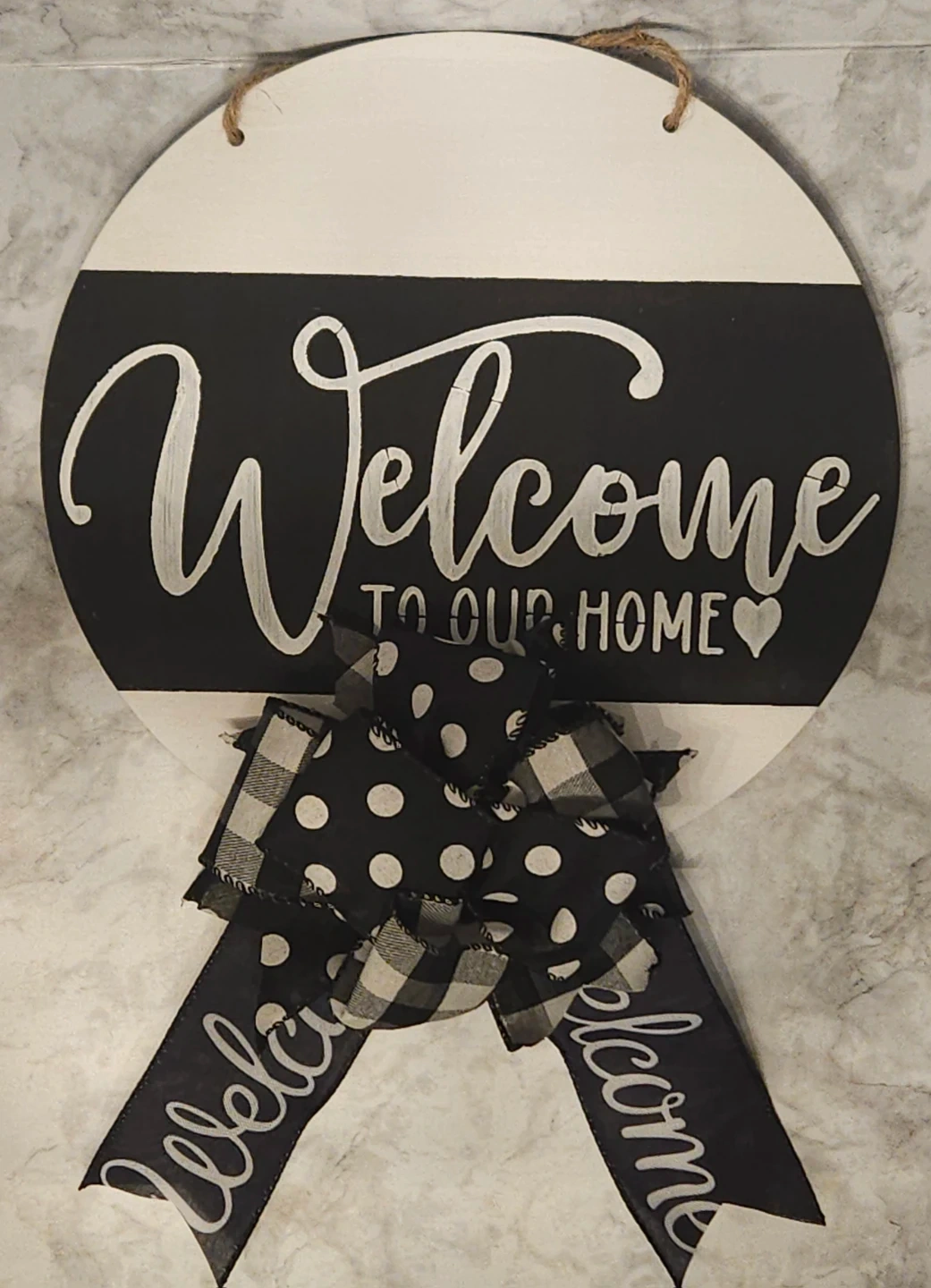 10Spruce up your front door with this charming 'Welcome to our Home' door hanger! It features a classic black and white design with a cute polka dot and checkered bow. Perfect for adding a cozy touch to your entryway. 12 Inches.