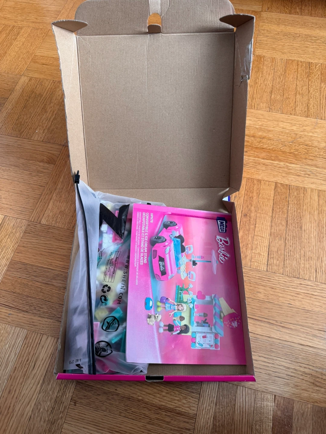 Selling a Mega Barbie Convertible & Ice Cream Stand set! Box is included. Some pieces are missing as circled in the instruction booklet.