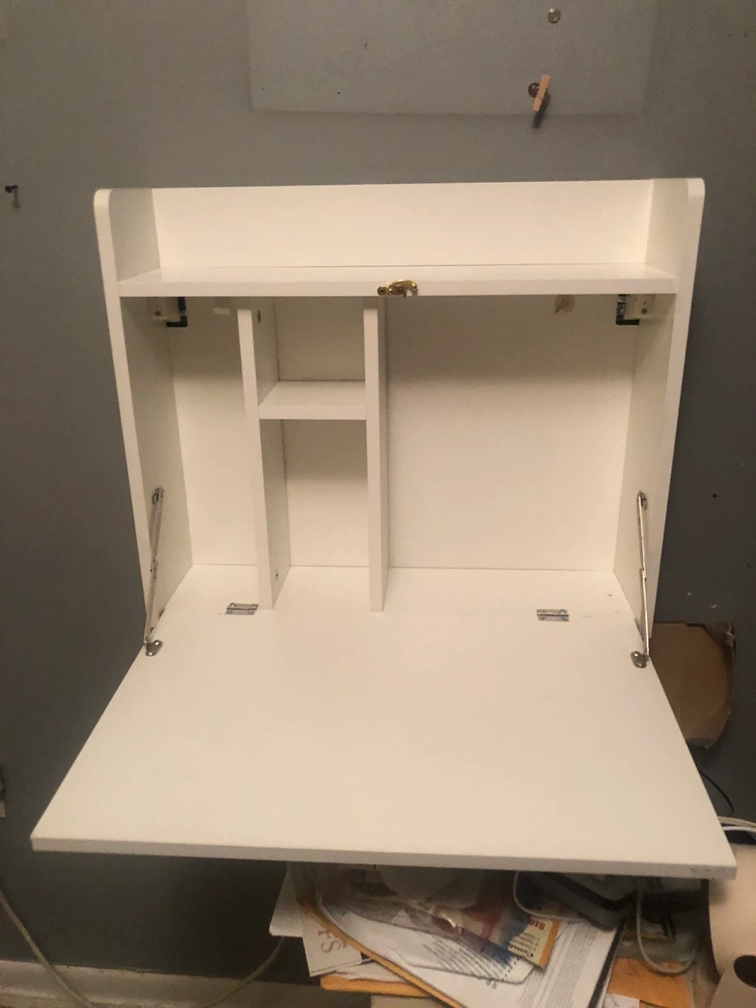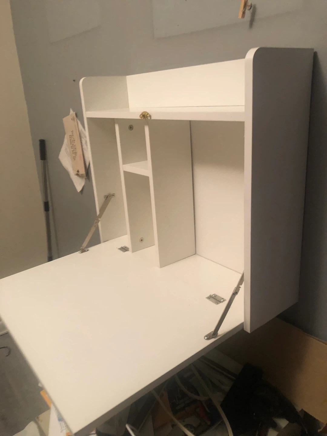 Here's a handy white wall-mounted folding desk! It's perfect for saving space and creating a little work area wherever you need it. It features a shelf and some compartments for organizing your things. Great for small spaces or anyone who likes to keep things tidy